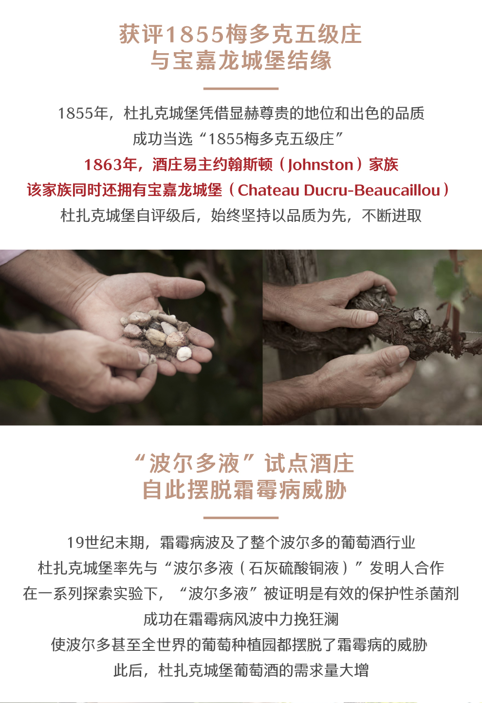威布克(Wiebroock)家族于1841年购入了这家酒庄,并且以自己的精湛技艺使杜扎克酒庄获得了业内的认可,在1855年的波尔多评级当中跻身于“列级酒庄第5级”。1863年,已经拥有杜克·宝嘉龙酒庄(Château Ducru-Baucaillou)的约翰斯顿(Johnston)家族,又将杜扎克酒庄收归于其麾下。