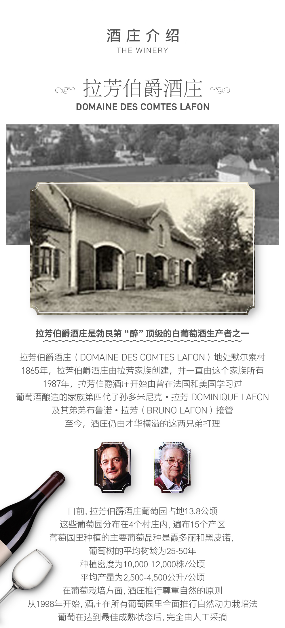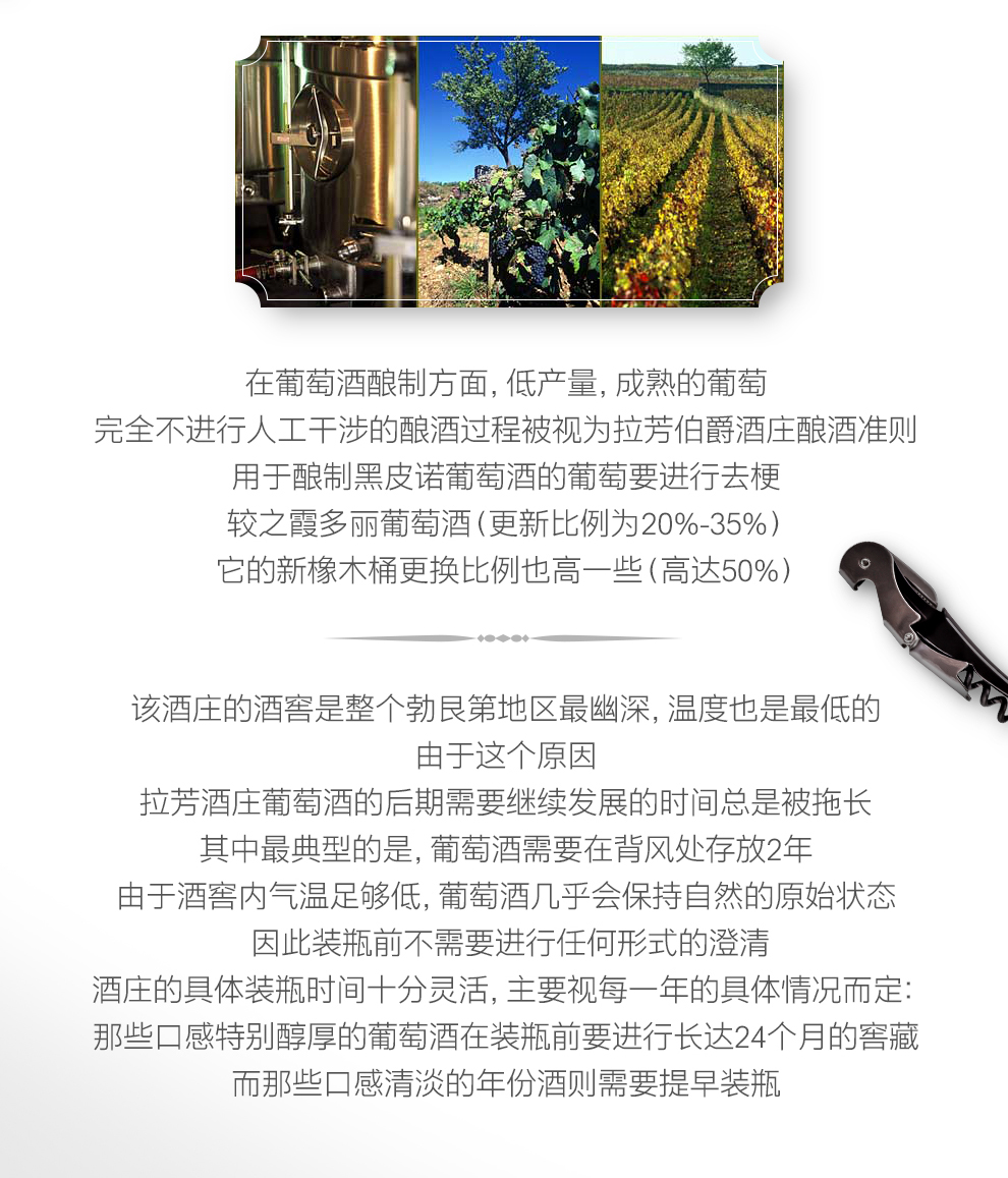 在葡萄酒酿制方面,低产量,成熟的葡萄,完全不进行人工干涉的酿酒过程被视为拉芳伯爵酒庄酿酒准则。用于酿制黑皮诺葡萄酒的葡萄要进行去梗,较之霞多丽葡萄酒(更新比例为20%-35%),它的新橡木桶更换比例也高一些(高达50%)。该酒庄的酒窖是整个勃艮第地区最幽深,温度也是最低的。由于这个原因,拉 芳酒庄葡萄酒的后期需要继续发展的时间总是被拖长,其中最典型的是,葡萄酒需要在背风处存放2年。由于酒窖内气温足够低,葡萄酒几乎会保持自然的原始状态, 因此装瓶前不需要进行任何形式的澄清。酒庄的具体装瓶时间十分灵活,主要视每一年的具体情况而定:那些口感特别醇厚的葡萄酒在装瓶前要进行长达24个月的 窖藏,而那些口感清淡的年份酒则需要提早装瓶。