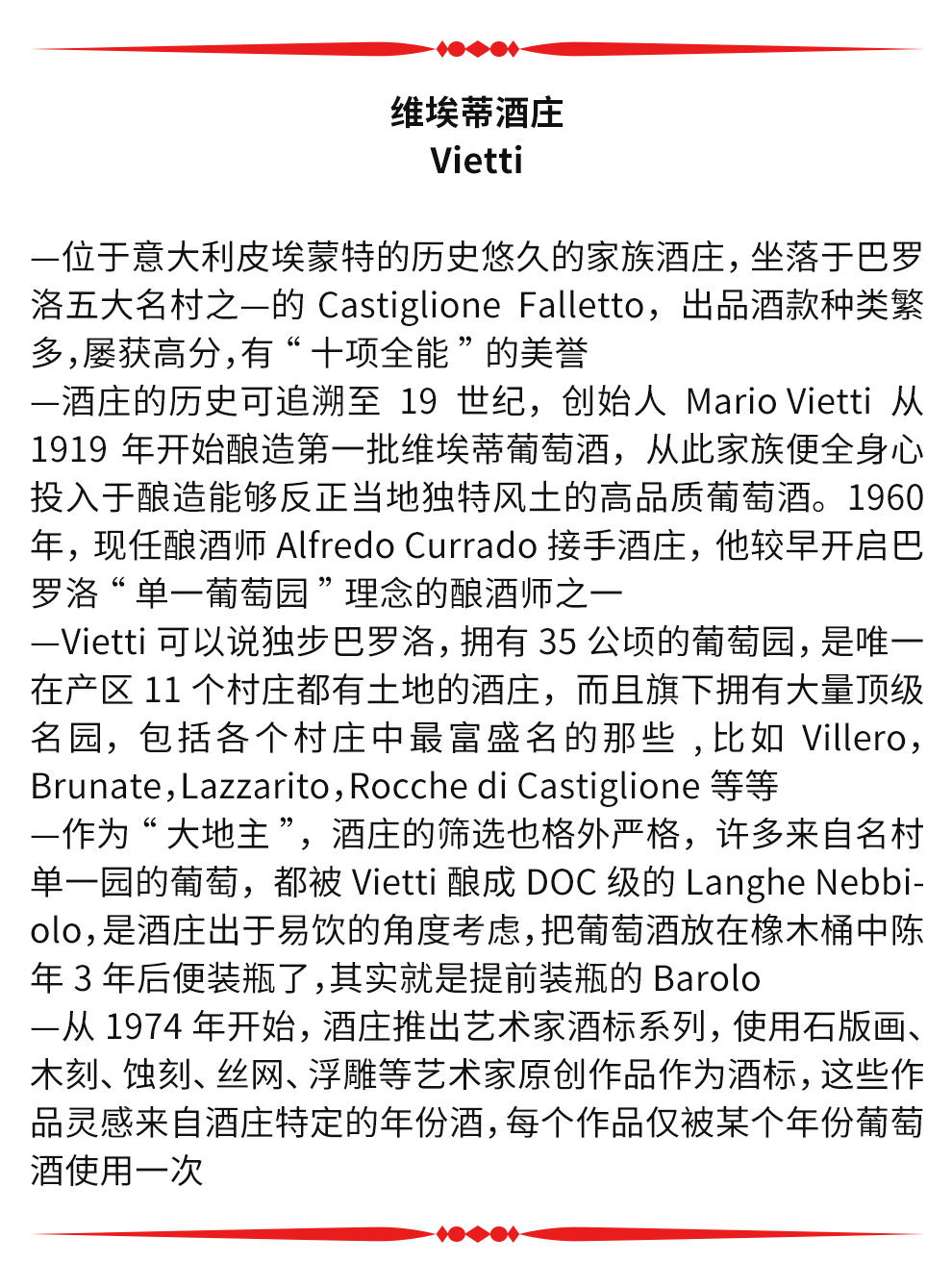 维埃蒂酒庄(Vietti)位于意大利皮埃蒙特(Piedmont)库内奥省(Cuneo)卡斯提里奥内·法列多(Castiglione Falletto)葡萄酒产区。该酒庄出产的葡萄酒不仅品质卓越,其中Vietti Barolo Ravera 2010年份葡萄酒荣获曾是《葡萄酒观察家》(Wine Spectator)酒评家安东尼·盖洛尼(Antonio Galloni)满分的评价,而且推出的“艺术家酒标的葡萄酒”创意更为葡萄酒增添了浓郁的艺术气息。