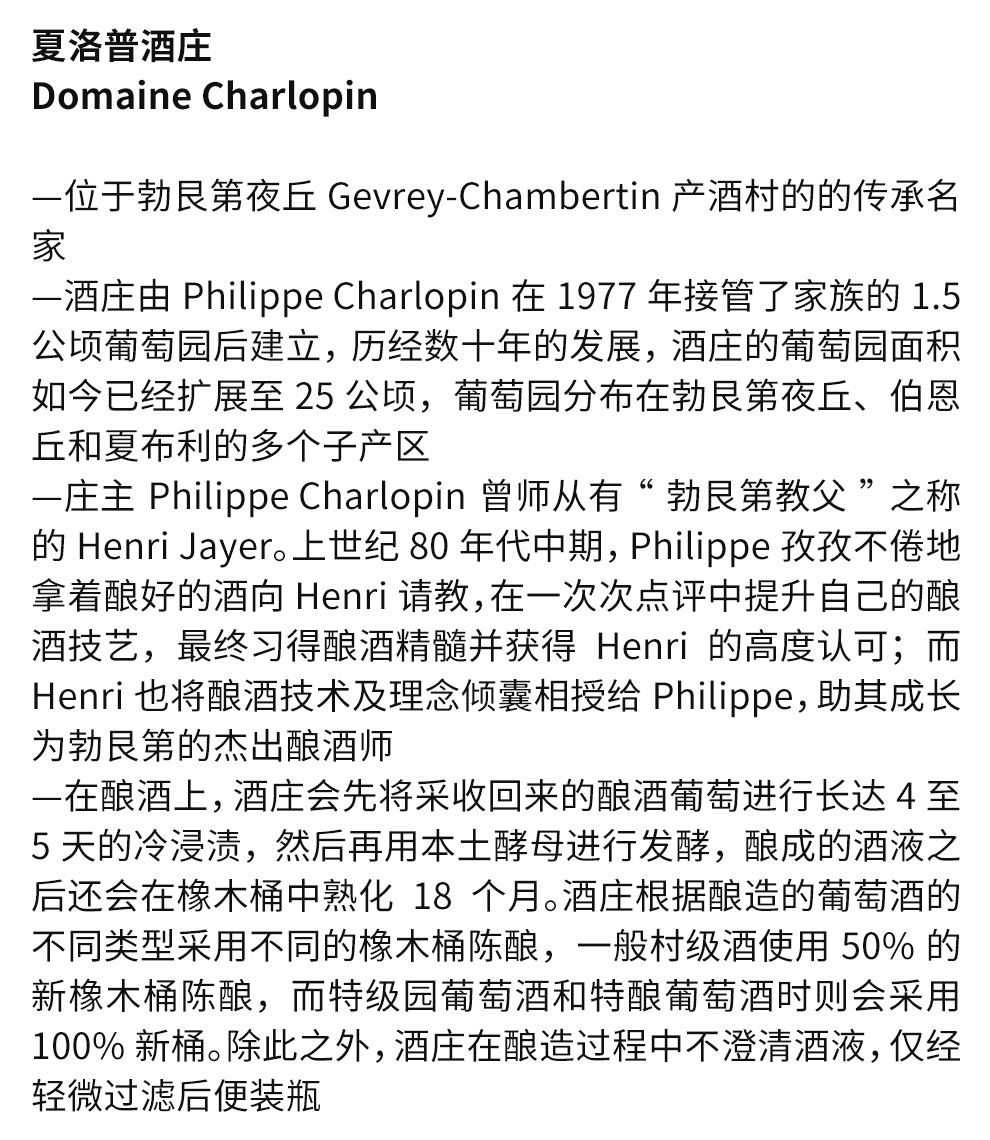 Domaine Charlopin位于法国勃艮第(Burgundy)夜丘(Cote de Nuits)的热夫雷-香贝丹(Gevrey-Chambertin)产区,是该产区内一座著名的家族式酒庄。