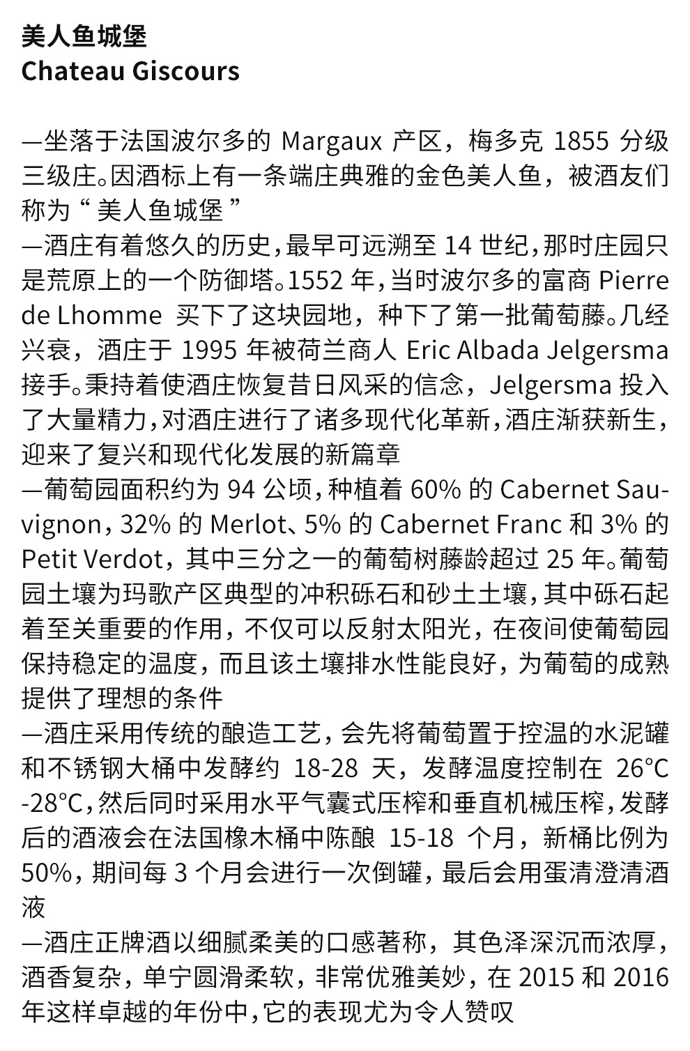 美人鱼城堡(Chateau Giscours)在1855年梅多克评级中被评为三级酒庄,因酒庄的酒标是一个美人鱼图像而被世人亲切地唤作“美人鱼”。美人鱼城堡坐落在世界顶级葡萄酒产区玛歌(Margaux),是梅多克产区最大的酒庄之一,也是波尔多产区最大的酒庄之一,距离波尔多西北部20公里,东起加斯科尼(Gascony)海湾、吉伦特(Gironde)河口,横跨在巨大的三角形梅多克半岛。