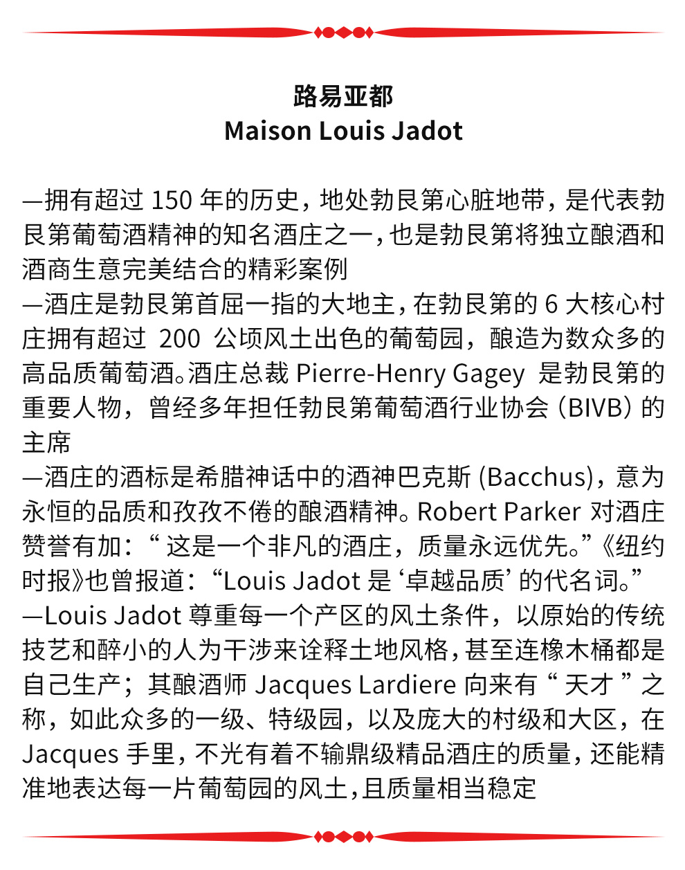 对路易亚都酒庄来说,酿酒的真谛在于能够将地方的风土条件在酒中诠释出来,而并非仅指细心栽培特定的葡萄品种,从而酿制出风味怡人的美酒。正是在这种理念的指引下,路易亚都成为了卓越品质的代名词。其画有酒神巴克斯(Bacchus)的酒标,象征着酒庄对其出产的各款酒品质的坚持,不管是产区级还是特级园级别的佳酿,路易亚都酒庄的品质都备受肯定。