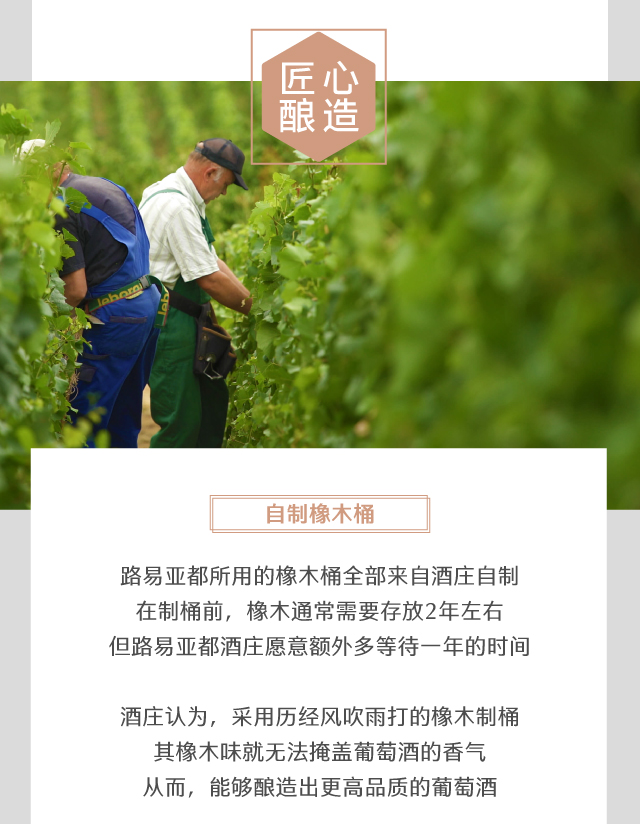 在酿酒方面,路易亚都所用的葡萄来于自家的葡萄园,或者是依照合同从葡萄种植者手中买来,这种做法在其他酒庄非常少见。该酒庄所用木桶均是自制的,技术娴熟的工匠一天可以做五个木桶。通常,橡木在制桶之前一般要放两年左右,而路易亚都酒庄则更愿意耐心地多等一年。在他们看来,经过风吹雨打后的橡木,制作出来的橡木桶,其橡木味就不会掩盖住酒香,这样能保证酒的高质量。