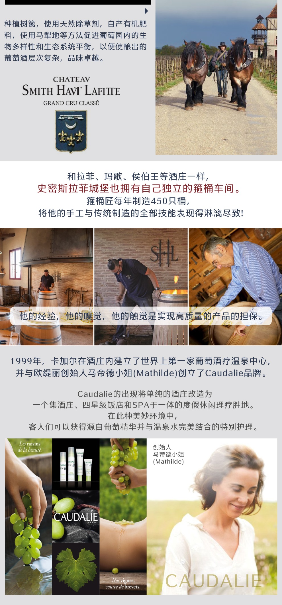 1999年,史密斯拉菲酒庄庄主Florence & Daniel Cathiard在酒庄内建立了世界上第一家葡萄酒疗温泉中心,并与马帝德小姐创立了Caudalie品牌。Caudalie是葡萄酒工艺的专业术语,是用来衡量品尝葡萄酒后余香在口中停留时间。一秒余香等于1caudalie。在此世间少有的美妙环境中,客人们可以获得源自葡萄精华并与温泉水完美结合的特别护理。Caudalie的出现将单纯的酒庄改造为一个集酒庄、四星级饭店和SPA于一体的度假休闲理疗胜地。