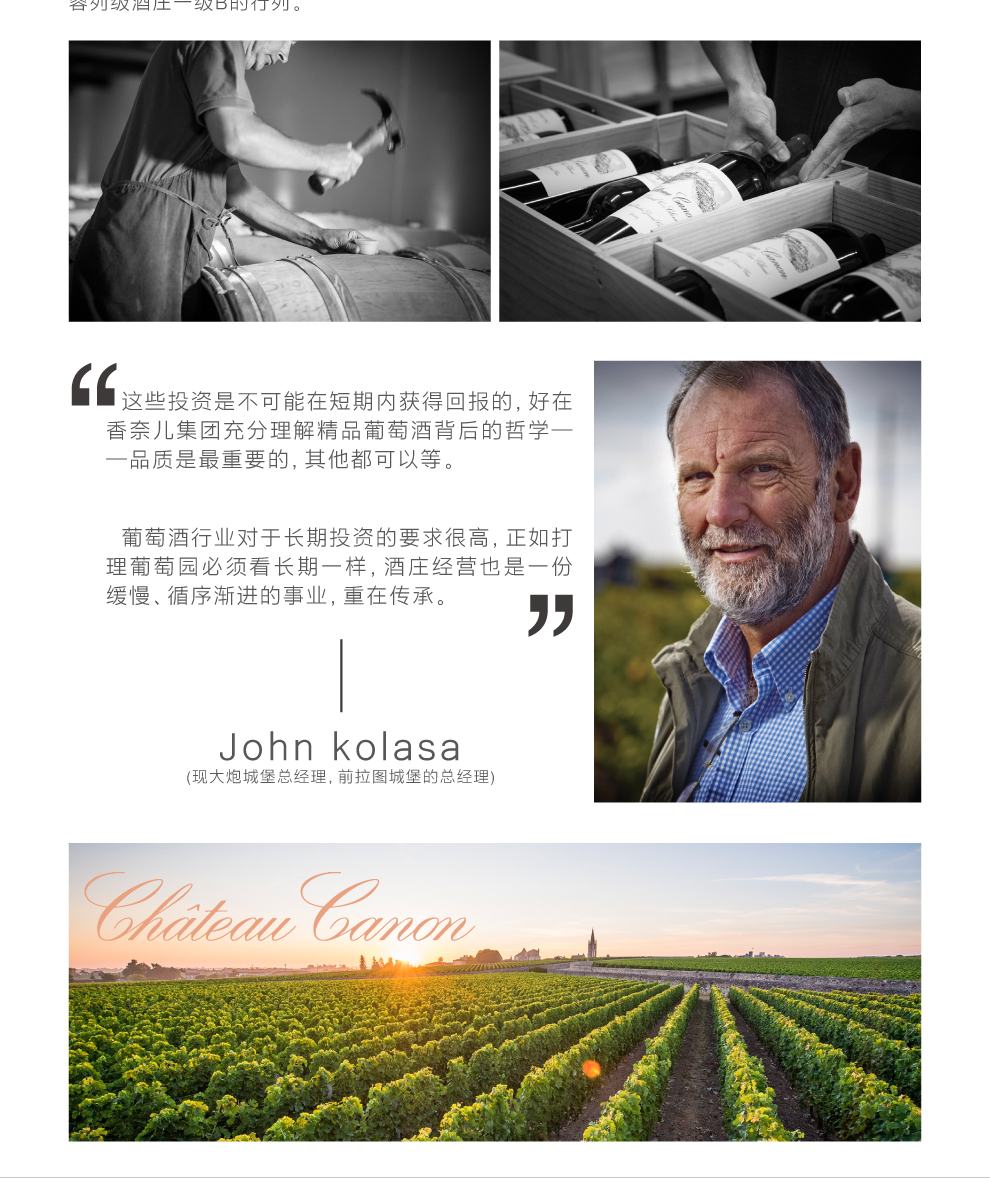 香奈儿集团(CHANEL)1996年买下法国波尔多圣爱美蓉产区(St.Emilion)的大炮城堡(Château Canon),从此酒庄的价值与日俱增。除了传统的时尚领域,香奈儿(CHANEL)更将它传奇的色彩注入了葡萄酒。