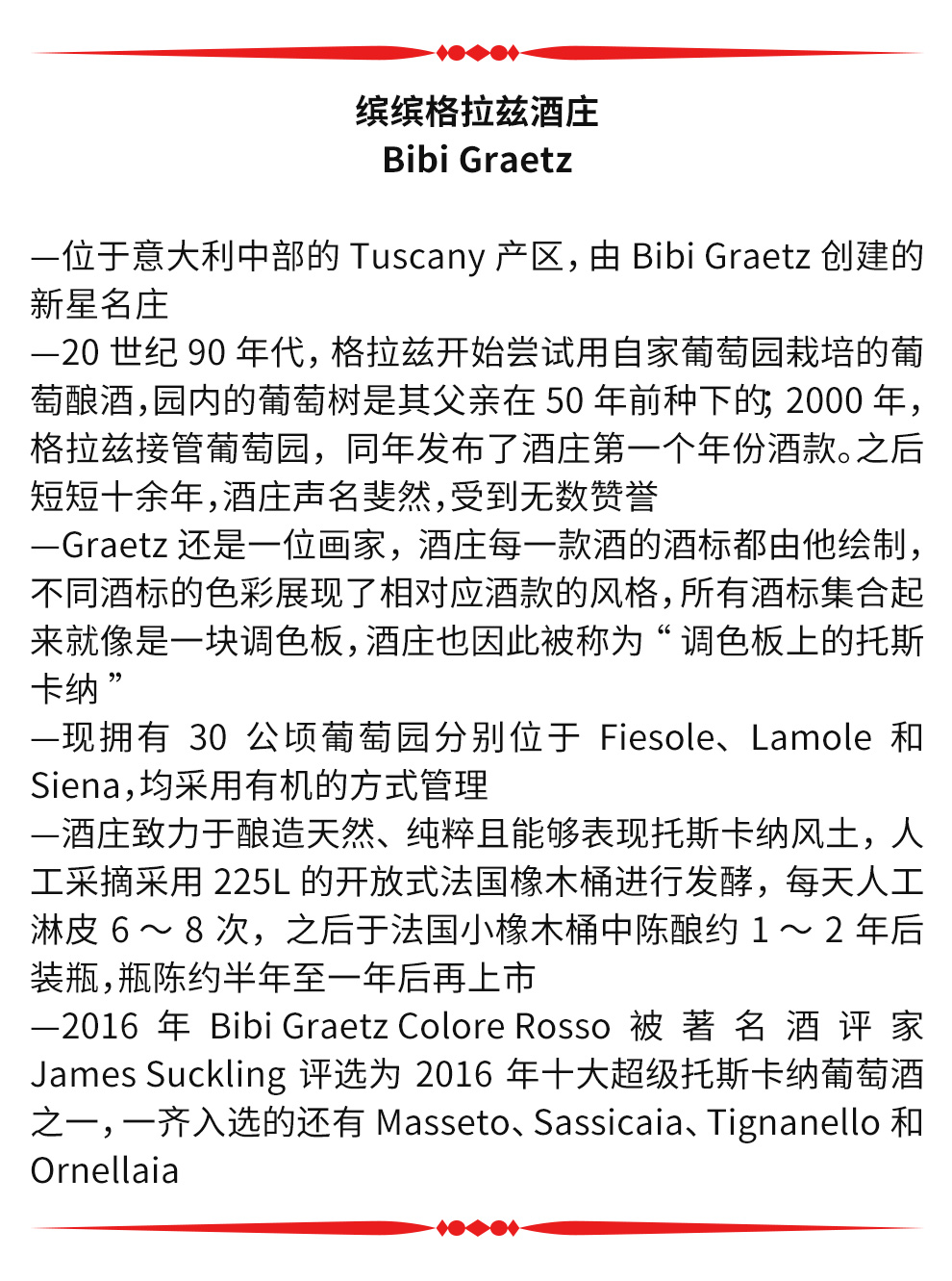 2016 Bibi Graetz Colore被著名酒评家James Suckling评选为2016年十大超级托斯卡纳(Top 10 Super Tuscans)葡萄酒之一