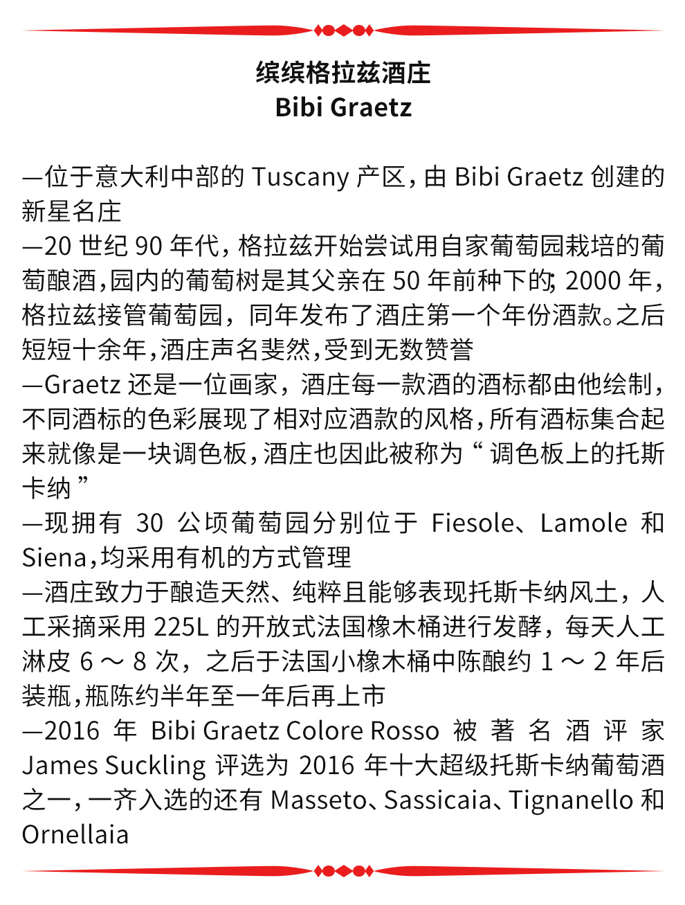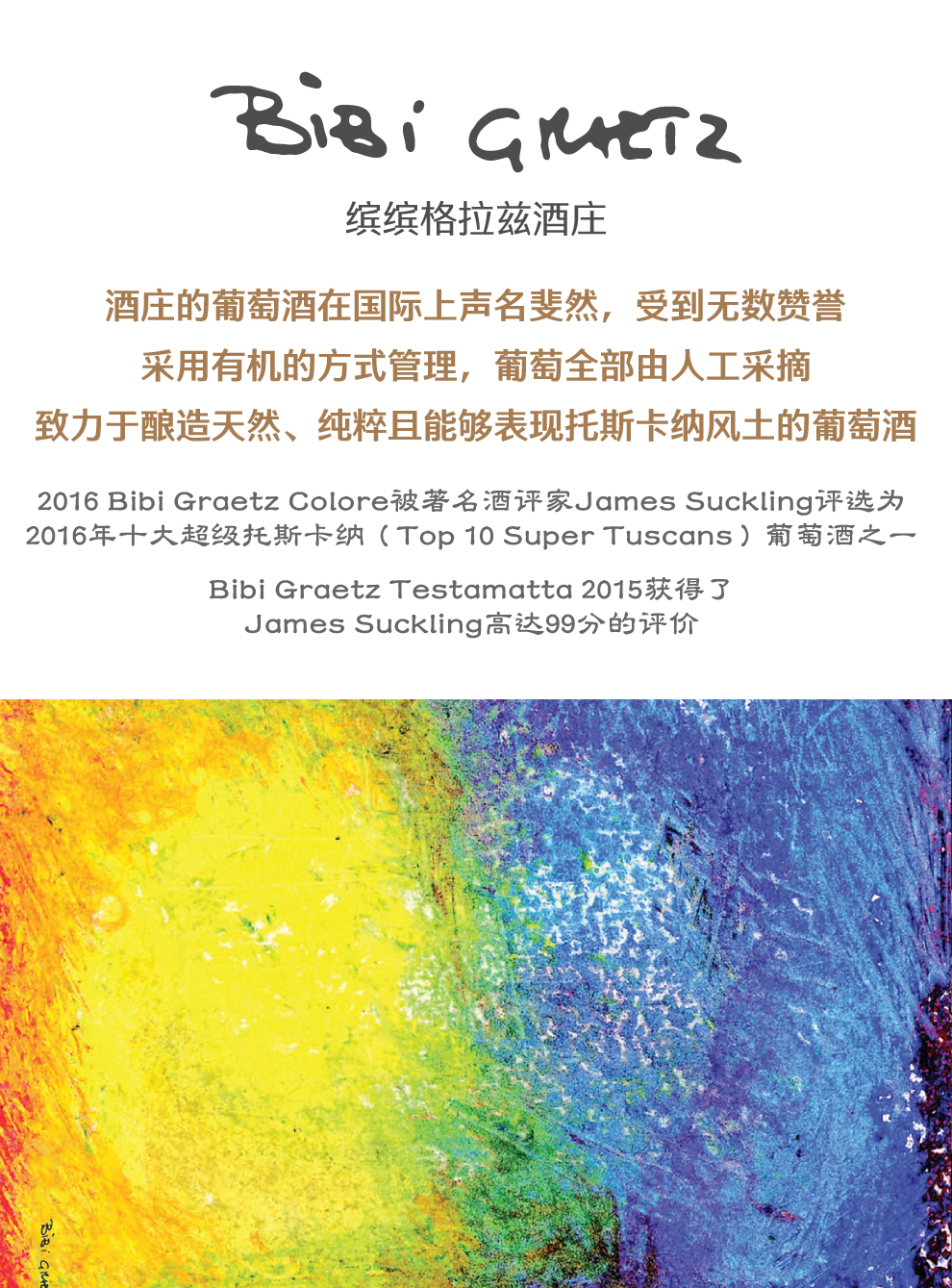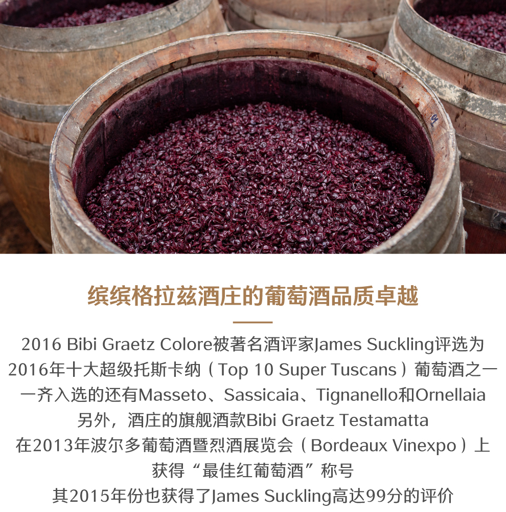 2016 Bibi Graetz Colore被著名酒评家James Suckling评选为2016年十大超级托斯卡纳(Top 10 Super Tuscans)葡萄酒之一