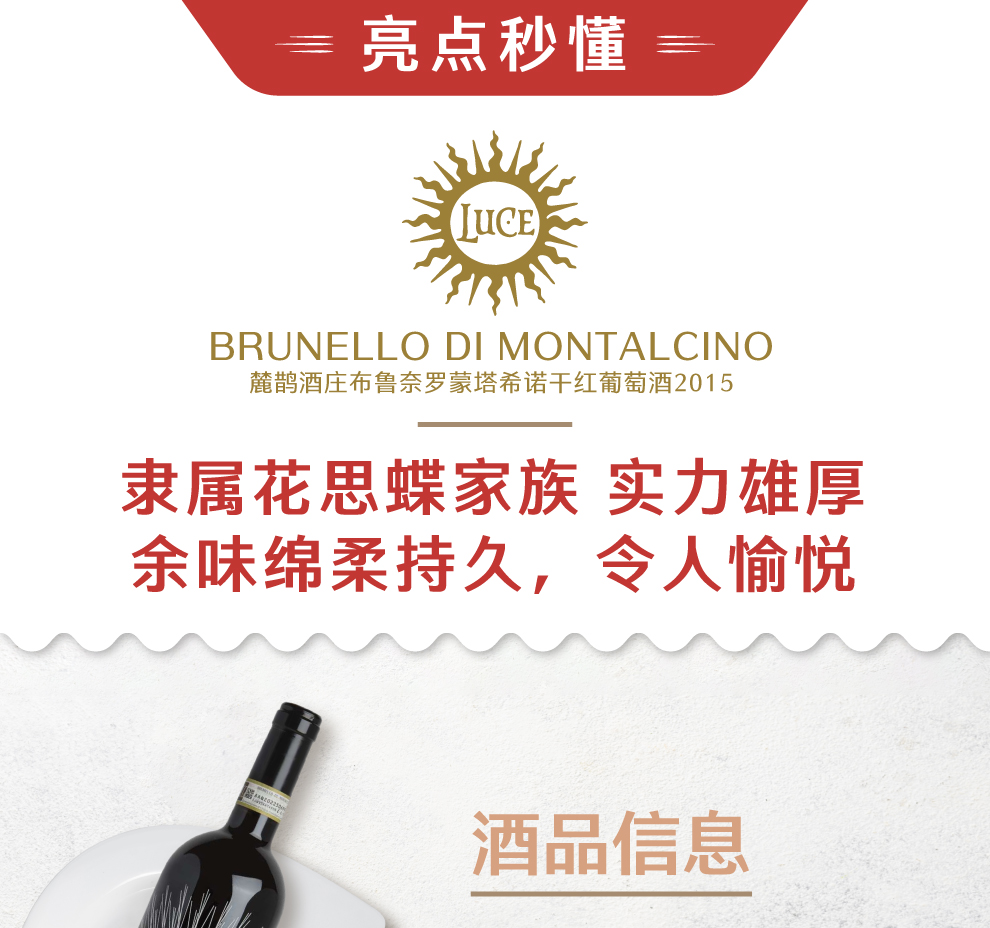 金色的太阳具有双重含义:生命和营养的源泉,是文化传承的标志。几个世纪以来,特别是在托斯卡纳,太阳的象征意义在世俗图像学和宗教图像学中都发挥着重要作用。事实上,麓鹊葡萄酒品牌所使用的标识,其灵感来自佛罗伦萨圣灵教堂(Santo Spirito)祭坛上的太阳,该教堂建在由花思蝶家族捐赠的土地上。该祭坛建于1599年至1607年,堪称公爵工匠的杰作,其上装饰着大理石嵌花,使得青金石、玛瑙和各种大理石缤纷多彩。人类历史周而往复,世代不断交替,而这里,却是永恒存在的。这是一种永恒的力量,每天,太阳升起,在天空中闪耀,或掠过云层,落在被藤蔓覆盖的平缓山丘的后方。力求酿制出优质的托斯卡纳葡萄酒。