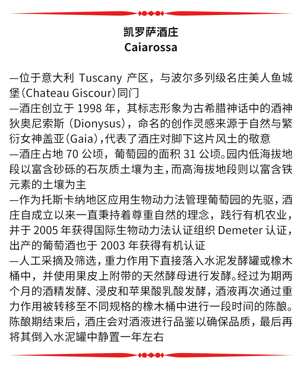 凯罗萨酒庄的LOGO是伊特鲁里亚人的古代陶土头像,是古希腊神话中的酒神,戴欧尼修斯,代表着Caiarossa的葡萄酒如古老的生命之泉以及感官的解放。 酒庄名字来自于家族对当地有着墨玉、岩石与小石子的红色土地的敬意,再加上Gaia女神(盖亚,希腊神话中大地女神,奥林匹斯山众神之母)名字的启发,于是就有了 “Caiarossa”。