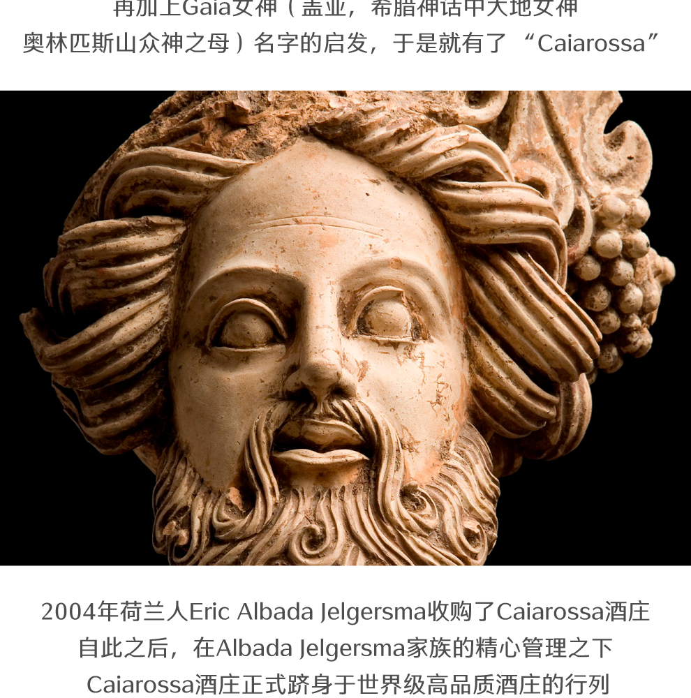 凯罗萨酒庄的LOGO是伊特鲁里亚人的古代陶土头像,是古希腊神话中的酒神,戴欧尼修斯,代表着Caiarossa的葡萄酒如古老的生命之泉以及感官的解放。 酒庄名字来自于家族对当地有着墨玉、岩石与小石子的红色土地的敬意,再加上Gaia女神(盖亚,希腊神话中大地女神,奥林匹斯山众神之母)名字的启发,于是就有了 “Caiarossa”。