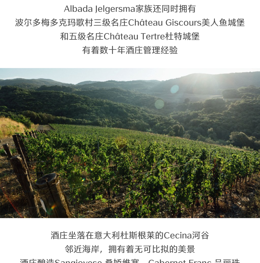 酒庄坐落在意大利杜斯根莱的Cecina河谷,邻近海岸,拥有着无可比拟的美景。酒庄酿造Sangiovese 桑娇维塞、Cabernet Franc 品丽珠、Merlot美乐、Cabernet Sauvignon 赤霞珠、Alicante 阿利坎特、Petit Verdot 小维度和Mourvedre穆合怀特等品种的混酿。