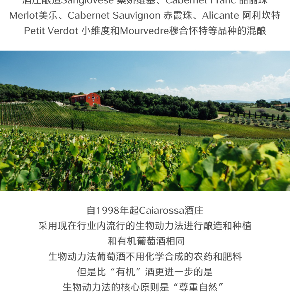 自1998年起Caiarossa酒庄采用现在行业内流行的生物动力法进行酿造和种植, 和有机葡萄酒相同,生物动力法葡萄酒不用化学合成的农药和肥料,但是比“有机”酒更进一步的是,生物动力法的核心原则是“尊重自然”,生物动力学认为,宇宙中所有的事物,包括月亮等一切天体都是相互联系,相互影响的。