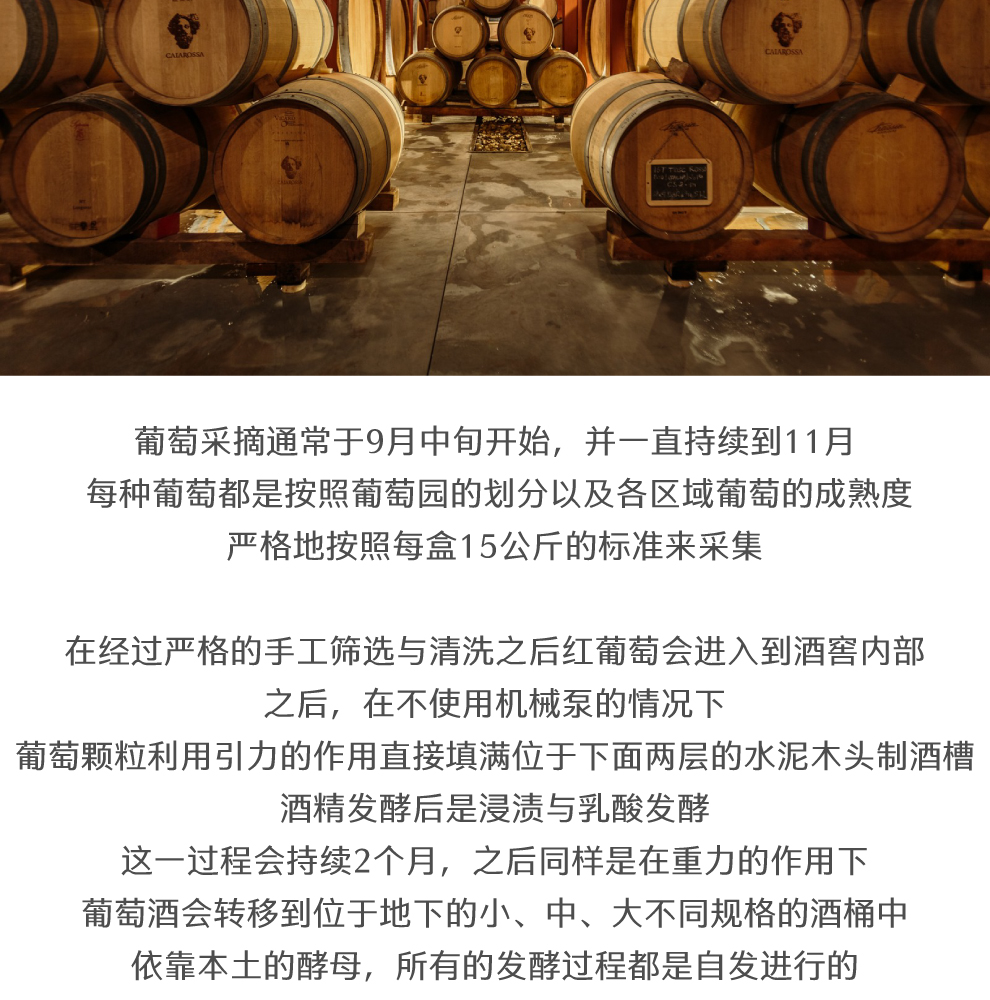 葡萄采摘是终年都在进行、漫长且艰苦的工作的最后一步,通常于9月中旬开始采摘,并一直持续到11月。 每种葡萄都是按照葡萄园的划分以及各区域葡萄的成熟度,严格地按照每盒15公斤的标准来采集。