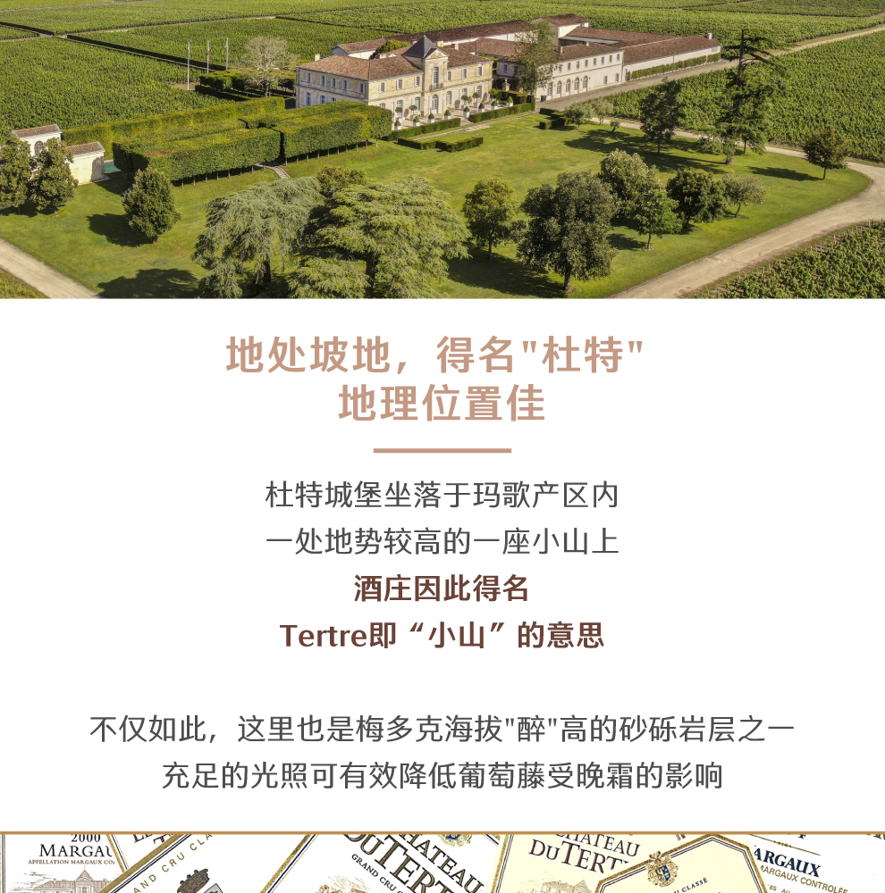 葡萄园位于玛歌产区地势最高处,同时也是梅多克海拔最高的砂砾岩层之一;光照充足,可有效降低葡萄藤受到春季晚霜的影响。