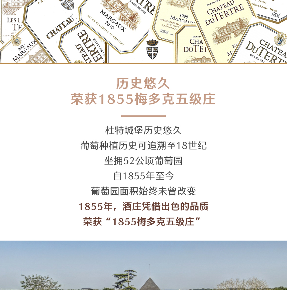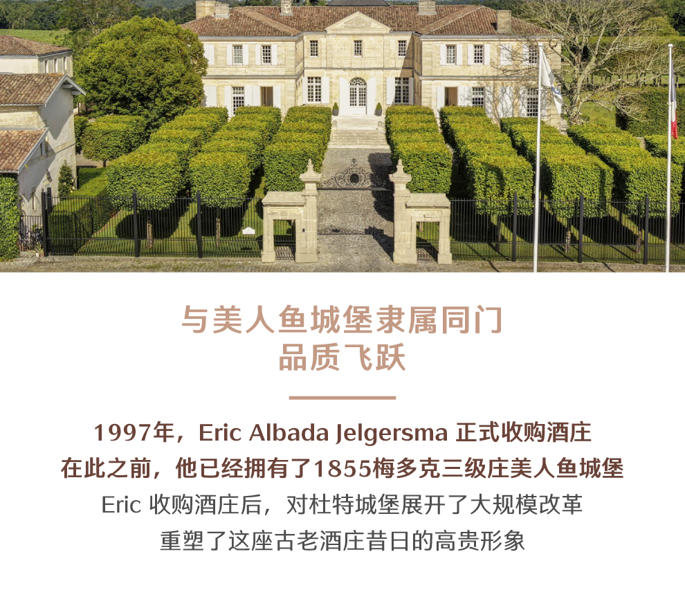 杜特酒庄历史长达千年,拥有52公顷葡萄园,自1855年至今葡萄园面积一直没有改变过。19世纪时,该酒庄葡萄酒在市场上颇有名气,尤其是在1855年评为五级庄后。1997年,荷兰商人Eric Albada Jelgersma 将酒庄收购,之后投入了大笔资金,进行大刀阔斧的建设,以此来重塑其高贵形象。