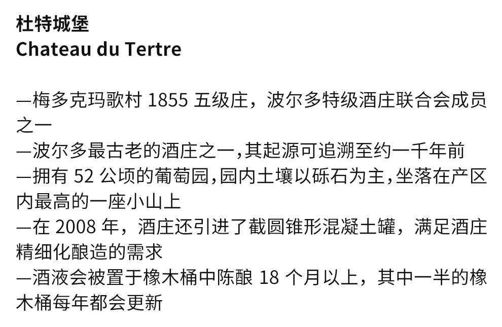 杜特城堡所出葡萄酒很好地体现了其优秀的风土条件。酒庄主要葡萄品种:赤霞珠,带来酒体与集中度;梅洛,使口感更加柔顺、饱满;品丽珠:以其丰富的香料味而出色;小维度:晚熟,为芬芳口感做有益补充。