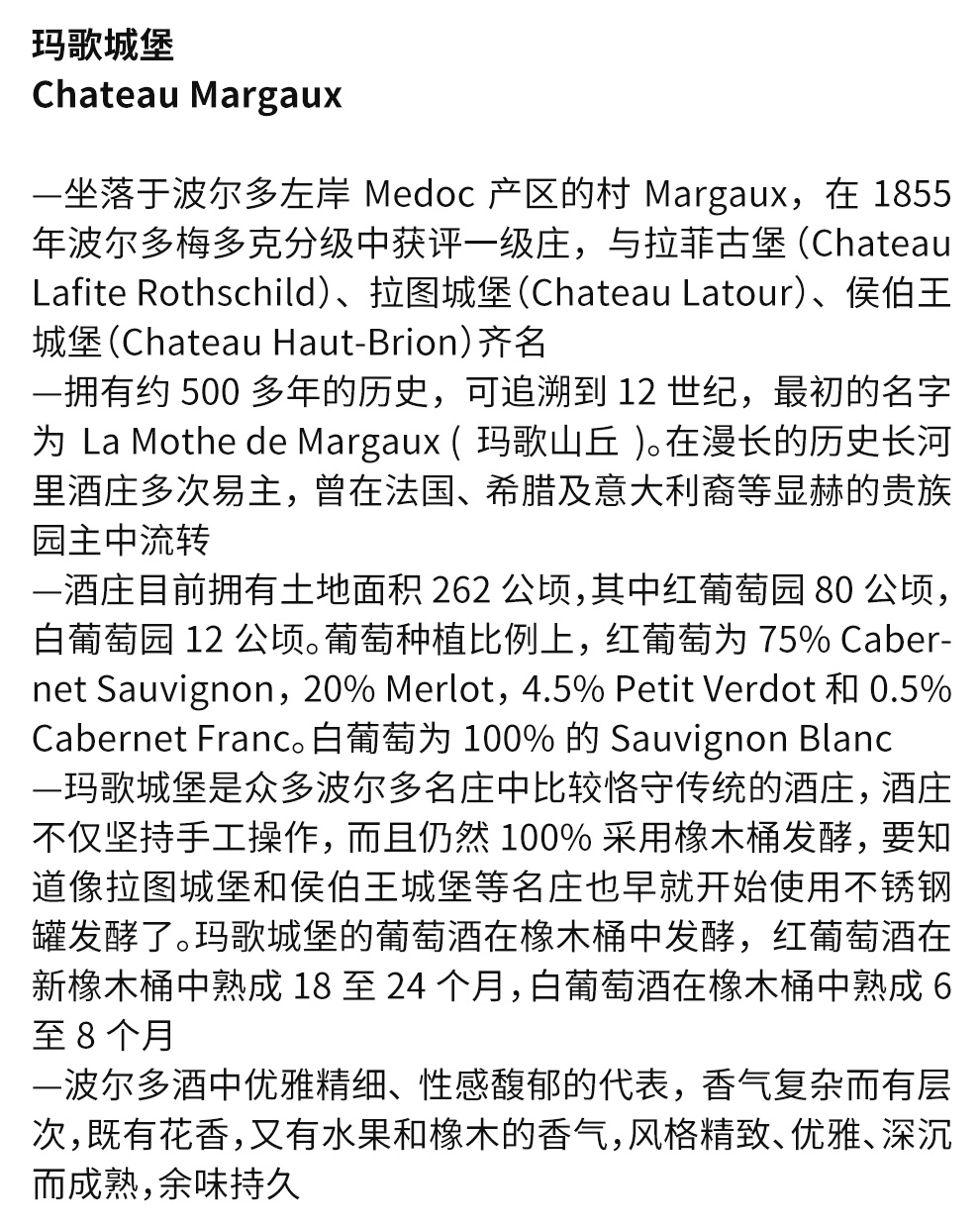 在波尔多的五大顶级酒庄中,玛歌堡的独特之处如同其城堡一样,是一种优雅迷人与气势磅礴的完美结合,其出产的产品均品质兼优,只要一上市常常被抢购一空。