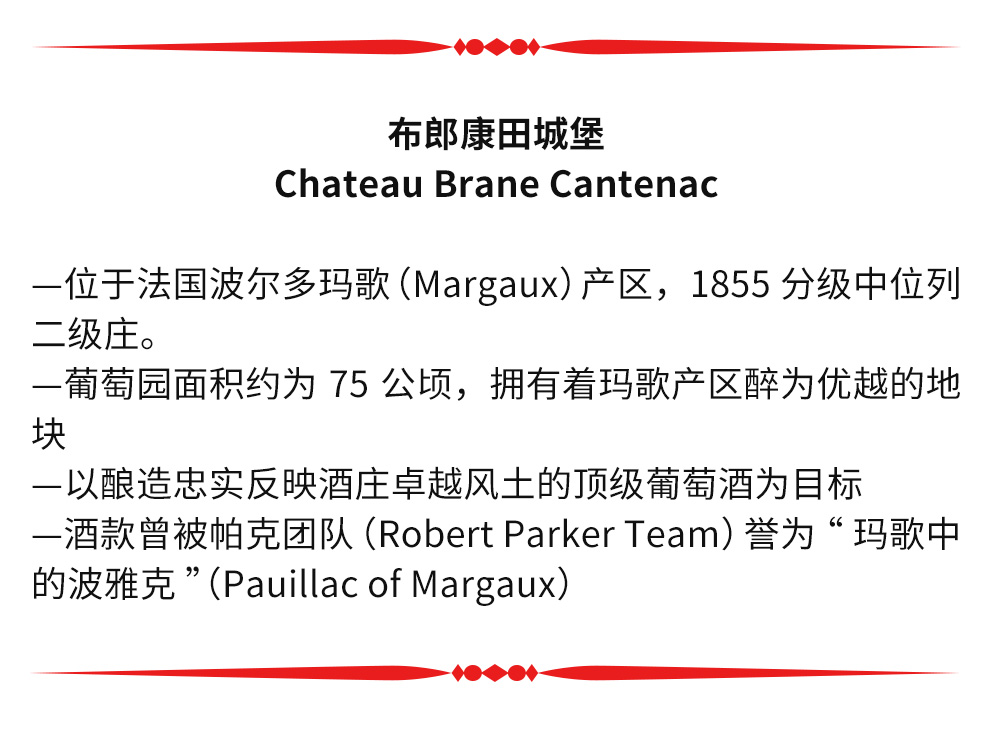 布郎康田的正牌是Chateau Brane Cantenac每一个年份均在50%新的橡木桶中陈酿12至18个月,某些好年份如1982等享有极高的评价,层次感丰富,口感醇厚。副牌是Le Baron de Brane。 布郎康田酒庄(Chateau Brane Cantenac)为Medoc产区最大酒庄之一,由于产量多市场广,使得这支酒名满天下,酒质圆润早熟富含水果味,柔顺容易入口,尤其适宜早饮,轻度醇厚。