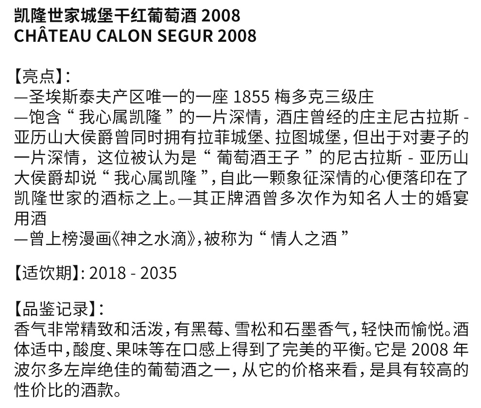 十八世纪时,身为波尔多议会主席的尼古拉斯·亚历山大侯爵 已经拥有了拉菲和拉图两大酒庄,后来他娶了寡妇Mme de Gasq, 同时也拥有了她的嫁妆凯隆酒庄,后来他将自己的姓氏(Segur)加到了酒庄名中,于是就成了今天的凯隆世家(Chateau Calon Segur). 他对凯隆世家的爱其实是出于对妻子的爱,他曾经这样说道“ Je fais du vin à Lafite et à Latour, mais mon cœur est à Calon ”(法语意为:我同时拥有拉菲和拉图,但我的心在凯隆。)这颗忠贞炽烈的心后来就成了凯隆世家的标志,并成为酒标的一部分。