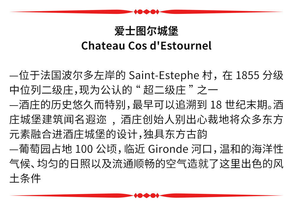 爱士图尔庄园闻名遐迩的城堡建筑同样出自创始人路易斯之手。对东方文化涉猎颇深且十分喜爱的路易斯别出心裁地将众多东方元素融合进酒庄城堡的设计中。他在酒庄城堡之上建造了雄伟的印度宝塔,宝塔之下则为华丽精美的酒窖,为爱士图尔庄园点缀上绮丽而沉静的东方色彩。此外,他还特意从桑给巴尔(Zanzibar)运回一道苏丹宫殿大门,并在城堡各处雕刻上象征着智慧的印度大象,将酒庄打造成“献给葡萄酒的一座豪华宫殿”,路易斯本人也因此被人们称为“圣埃斯泰夫大君(Maharajah of Saint-Estephe)”。如今,爱士图尔这座独具东方古韵的城堡已成为波尔多最热门的景点之一。