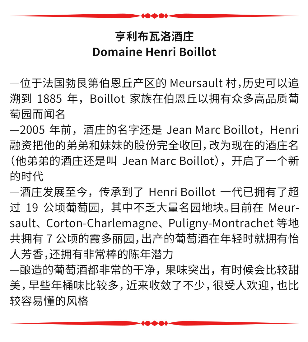 亨利布瓦洛酒庄的历史最早可以追溯到1885年。从那时起,亨利布瓦洛家族就已经开始种植葡萄树并酿酒了。布瓦洛酒庄原名是“Domaine Jean Boillot”,根据亨利布瓦洛家族第四代传人让·布瓦洛(Jean Boillot)的名字命名。2005年,让·布瓦洛的儿子亨利·布瓦洛(Henry Boillot)将其他兄妹名下的产业股权买了下来,并将这些产业重新整合为一个酒庄,最后改名为“Domaine Henri Boillot”。酒庄目前的庄主亨利·布瓦洛是布瓦洛家族的第五代传人。近几年,他的儿子吉月莫(Guillaume)也加入到酒庄的经营中来。