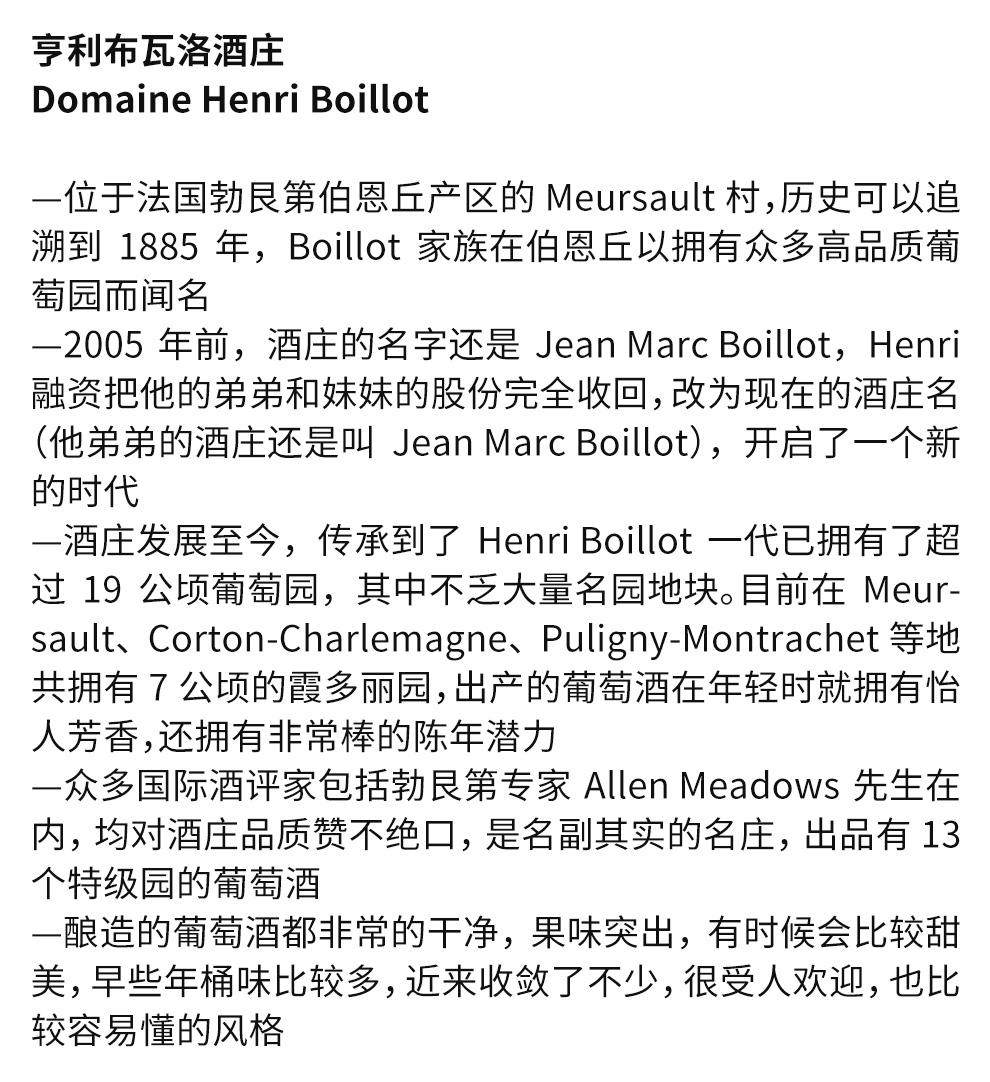 亨利布瓦洛酒庄的历史最早可以追溯到1885年。从那时起,亨利布瓦洛家族就已经开始种植葡萄树并酿酒了。布瓦洛酒庄原名是“Domaine Jean Boillot”,根据亨利布瓦洛家族第四代传人让·布瓦洛(Jean Boillot)的名字命名。2005年,让·布瓦洛的儿子亨利·布瓦洛(Henry Boillot)将其他兄妹名下的产业股权买了下来,并将这些产业重新整合为一个酒庄,最后改名为“Domaine Henri Boillot”。酒庄目前的庄主亨利·布瓦洛是布瓦洛家族的第五代传人。近几年,他的儿子吉月莫(Guillaume)也加入到酒庄的经营中来。