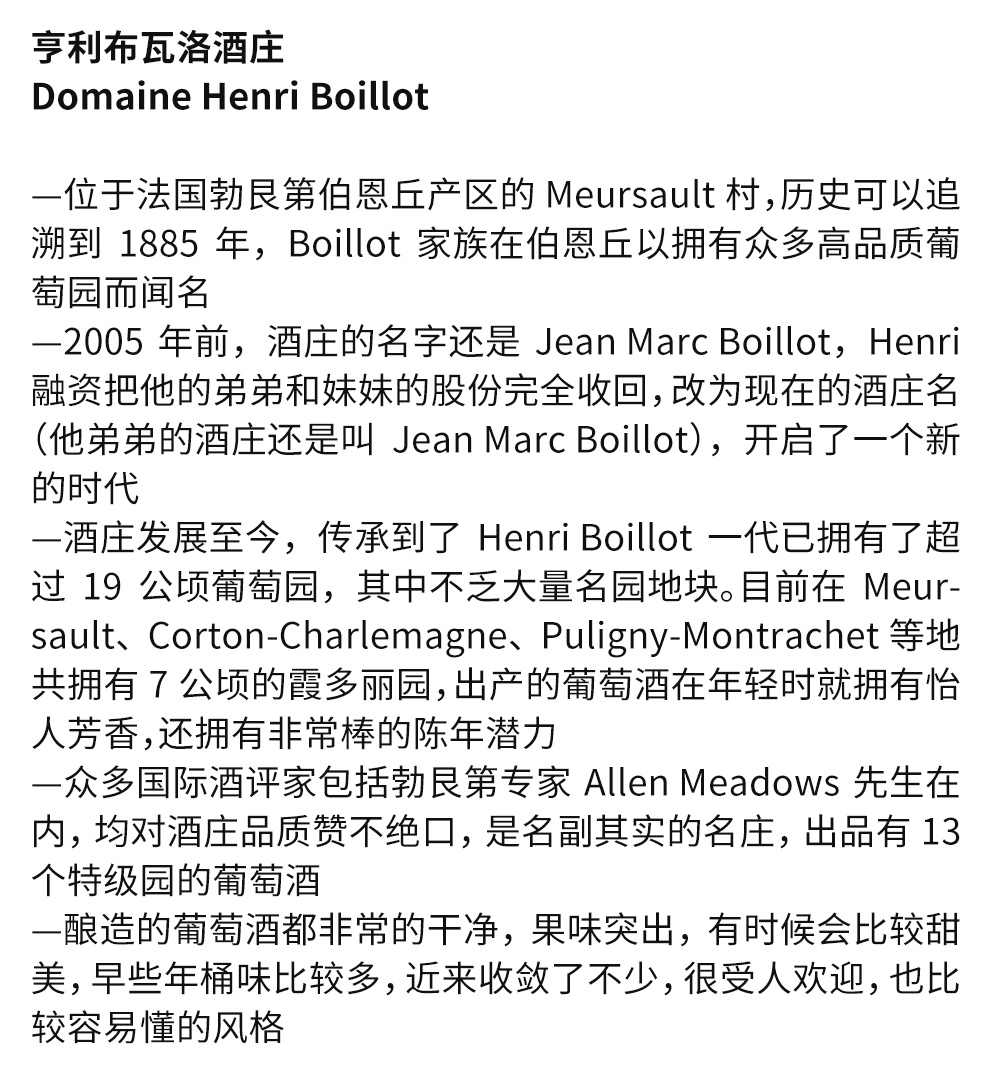 亨利布瓦洛酒庄的历史最早可以追溯到1885年。从那时起,亨利布瓦洛家族就已经开始种植葡萄树并酿酒了。布瓦洛酒庄原名是“Domaine Jean Boillot”,根据亨利布瓦洛家族第四代传人让·布瓦洛(Jean Boillot)的名字命名。2005年,让·布瓦洛的儿子亨利·布瓦洛(Henry Boillot)将其他兄妹名下的产业股权买了下来,并将这些产业重新整合为一个酒庄,最后改名为“Domaine Henri Boillot”。酒庄目前的庄主亨利·布瓦洛是布瓦洛家族的第五代传人。近几年,他的儿子吉月莫(Guillaume)也加入到酒庄的经营中来。