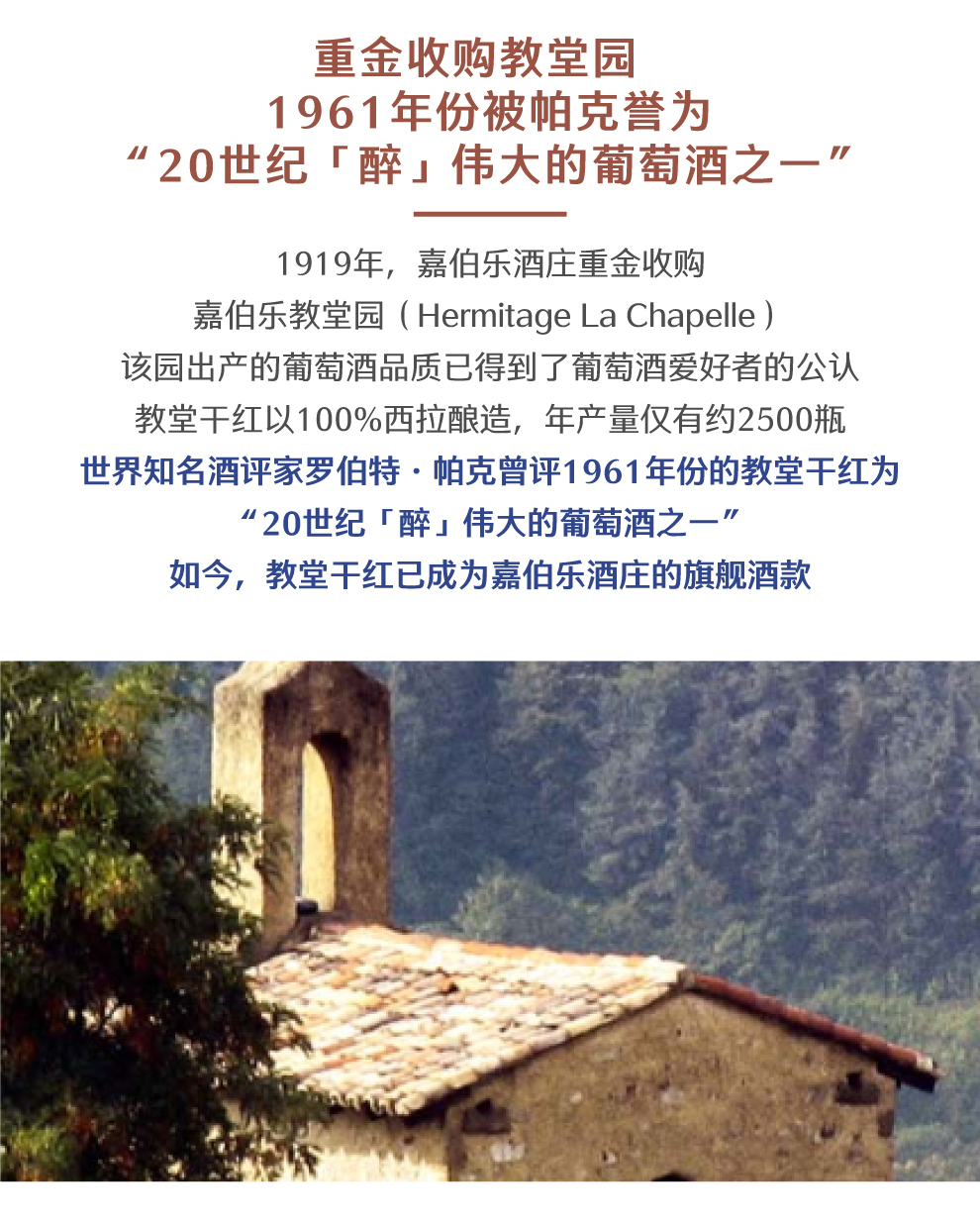 法国罗纳河谷产区最著名最具代表性的酒庄。拥有上百公顷葡萄园、年产酒量近400万瓶的超级酒庄。嘉伯乐教堂园(Hermitage La Chapelle)的顶级红葡萄酒嘉伯乐教堂园红葡萄酒已经被收列为全世界最出众的红葡萄酒之列。出口至70多个国家,高雅却平价的好酒,完美地呈现了罗纳河谷产区酒的特色
