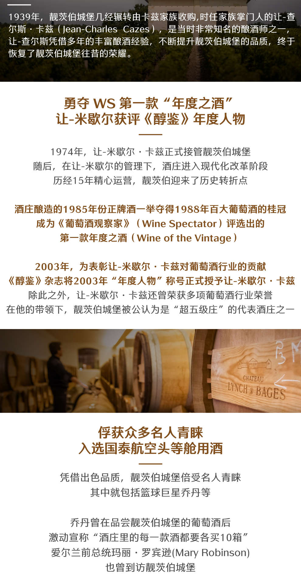 除此前来酒庄参观的著名来访者,有爱尔兰前总统玛丽·罗宾逊(Mary Robinson)和迈克尔·乔丹(Michael Jordan)。早在20世纪90年代初,这位世界著名的篮球明星曾入住卡兹家族经营的位于波亚克科德兰·巴斯(Cordeillan Bages)的豪华酒店。在他品尝过“Lynch-Bages”葡萄酒之后,他问及哪些酒是最好的年份,得到的回答是1959年,1961年,1982年,1986年和1989年。