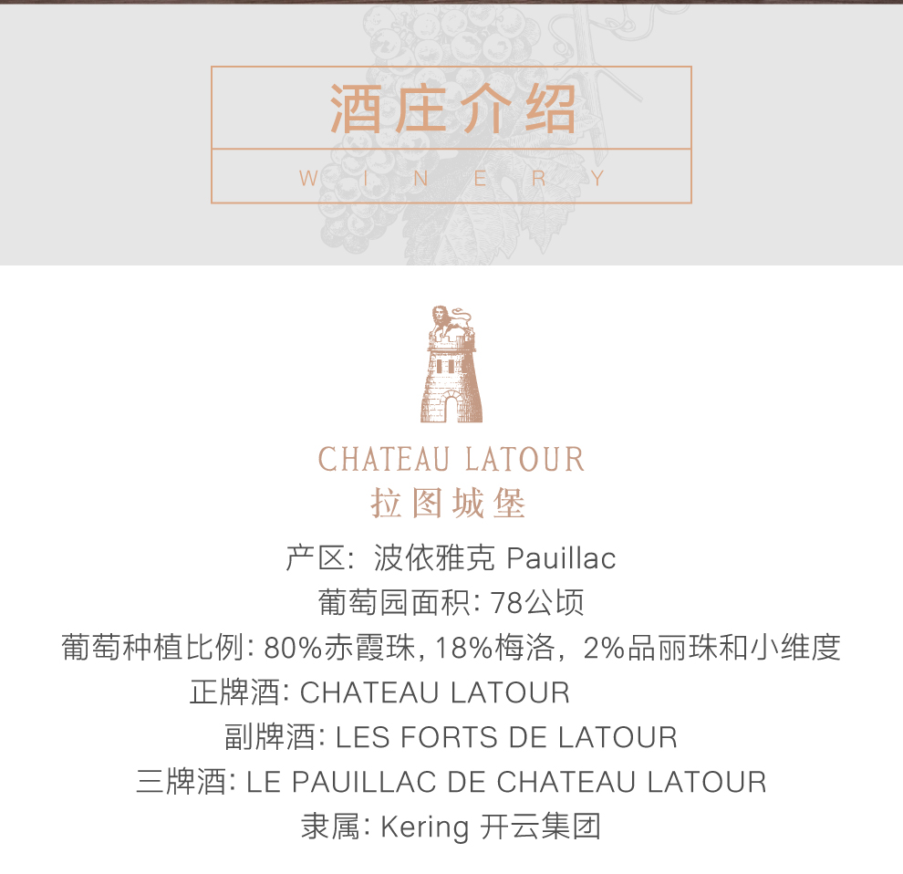 【葡萄品种】: 91.5% Cabernet Sauvignon 赤霞珠, 7.5% Merlot 梅洛, 0.5% Cabernet Franc 品丽珠, 0.5% Petit Verdot 小维度