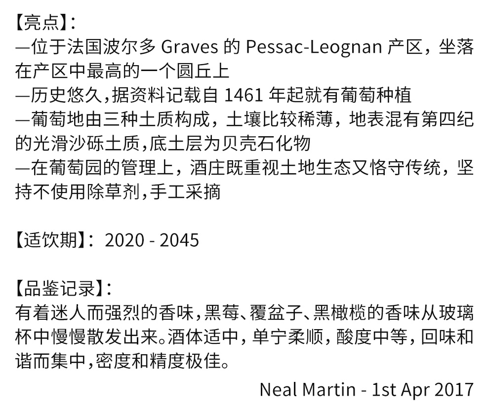 高柏丽城堡座落在吉伦特河(Gironde)左岸格拉夫(Graves)产区中最高的一个圆丘上,它庄严地俯视着30公顷的整片葡萄园,园内有个完美的斜坡,土质具有高效的吸水功能,均匀分布的洼面在多雨的年份里能保证水份的有效排放。葡萄地由三种土质构成,土壤比较稀薄,地表混有第四纪的光滑沙砾土质,底土层为贝壳石化物。