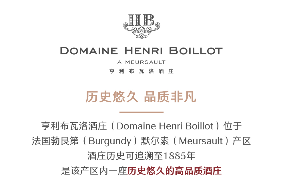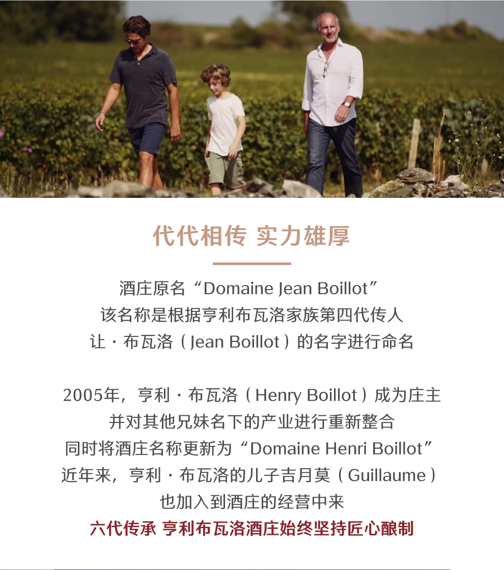 亨利布瓦洛酒庄的历史最早可以追溯到1885年。从那时起,亨利布瓦洛家族就已经开始种植葡萄树并酿酒了。布瓦洛酒庄原名是“Domaine Jean Boillot”,根据亨利布瓦洛家族第四代传人让·布瓦洛(Jean Boillot)的名字命名。2005年,让·布瓦洛的儿子亨利·布瓦洛(Henry Boillot)将其他兄妹名下的产业股权买了下来,并将这些产业重新整合为一个酒庄,最后改名为“Domaine Henri Boillot”。酒庄目前的庄主亨利·布瓦洛是布瓦洛家族的第五代传人。近几年,他的儿子吉月莫(Guillaume)也加入到酒庄的经营中来。