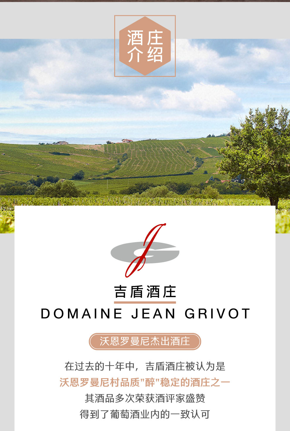 在过去的十年中,DOMAINE JEAN GRIVOT(吉盾酒庄)被认为是VOSNE ROMANEE (沃恩罗曼尼)中非常出名也是出产品质最稳定的酒庄之一。DOMAINE JEAN GRIVOT(吉盾酒庄)的历史可以追溯到法国大革命时期,当时GRIVOT家族举家从JURA (汝拉)地区迁移到勃艮第的VOSNE ROMANEE (沃恩罗曼尼),但实际上,家族最早的历史可以追溯到意大利的 VAL D’AOSTA(奥斯达山谷)。随后他们买入了勃艮第CLOS DE VOUGEOT (伏旧园)的葡萄园,又通过和JAYER家族的联姻获得了来自CHAMBOLLE MUSIGNY (香波蜜思妮)、VOSNE ROMANEE (沃恩罗曼尼)和ECHEZEAUX (依瑟索)的葡萄园。