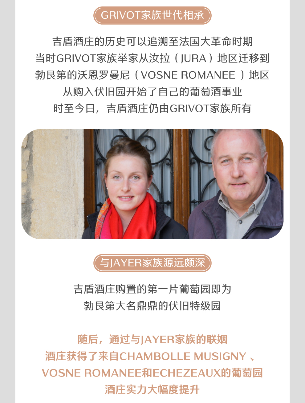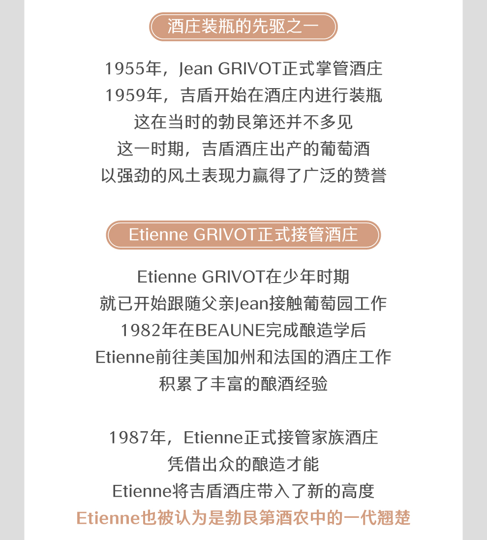 1955年,Jean GRIVOT在父亲去世后接管了酒庄的经营。1959年,所有酒庄的葡萄酒开始自己装瓶,这在当时的勃艮第还并不多见。因此,酒庄出产的葡萄酒以强劲的风土表现力赢得了广泛的赞誉。Jean GRIVOT的儿子Etienne GRIVOT在十几岁时就跟随父亲一起工作,正是在他的不懈努力下, DOMAINE JEAN GRIVOT(吉盾酒庄)才有了今天的名气和地位。 Etienne GRIVOT于1982年在BEAUNE完成酿造学后,曾在美国加州和法国的酒庄工作,积累了丰富的酿酒经验, 随后Etienne GRIVOT逐渐开始接手酒庄的管理,自1987年以来,他一直负责葡萄园和酒窖的工作。