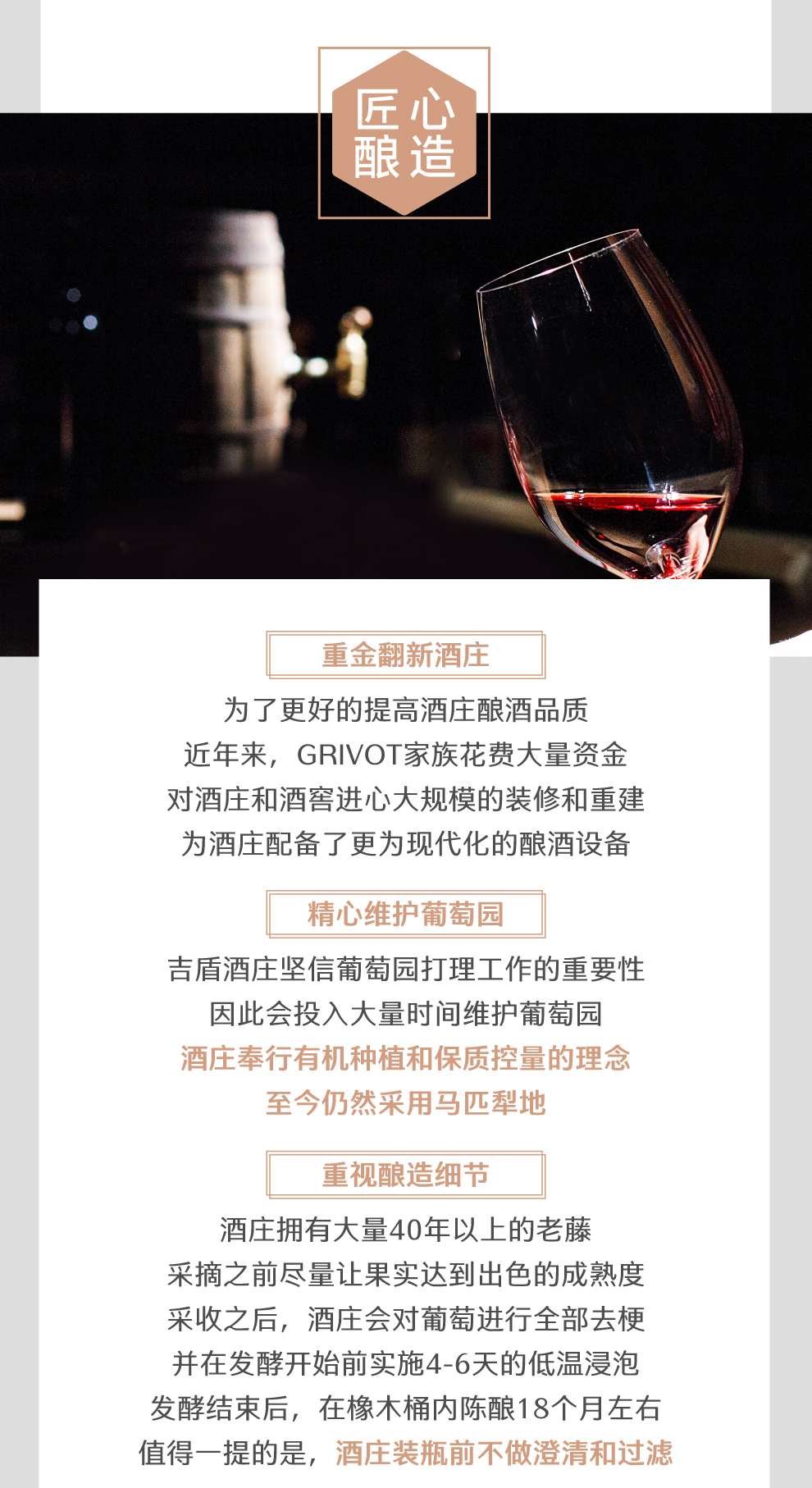 渐渐地, Etienne GRIVOT开始把酒庄的管理交到子女手中。才华横溢的Mathilde 在保持GRIVOT家族悠久传统的同时,为酒庄注入了新的生命。 近年来,家族花费大量资金对酒庄和酒窖经过了大规模的装修和重建。庄主一直坚信,葡萄园的打理工作最为重要,他们会花费大量时间维护葡萄园,酒庄拥有大量的40岁以上的老藤,庄主秉承有机种植和保质控量的理念,至今采用马犁地,采摘之前尽量让果实达到最完美的成熟度。采收之后,酒庄会对葡萄进行全部去梗,并在发酵开始前实施4-6天的低温浸泡,发酵结束后,在橡木桶内陈酿18个月左右,装瓶前不做澄清和过滤。