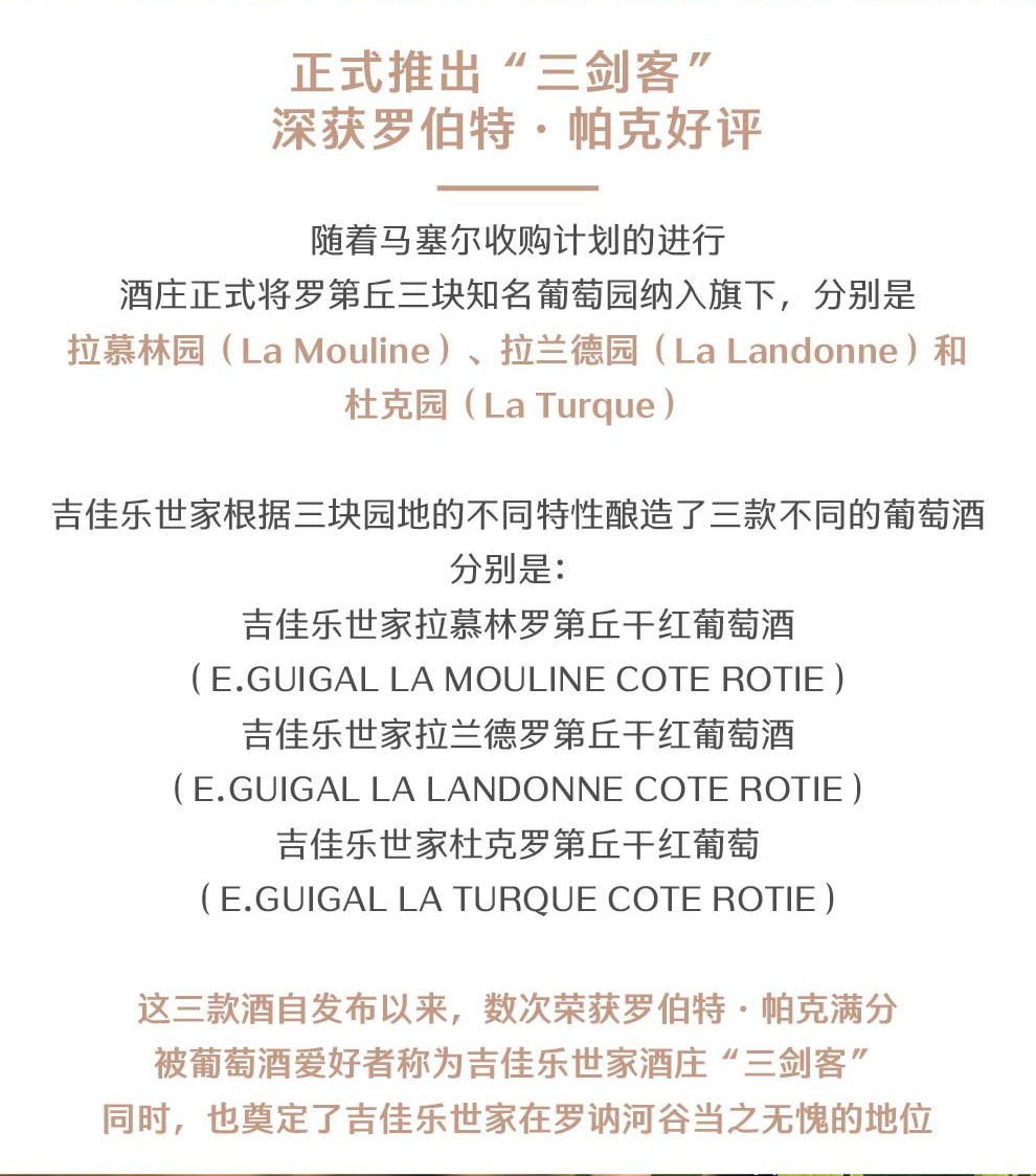 吉佳乐世家酒庄(E. Guigal)是罗第丘(Cote-Rotie)最富盛名,也是最重要的酒庄。1946年,艾蒂安•吉佳乐(Etienne Guigal)在罗第丘的酿酒中心阿布斯村(Ampuis)创建了该酒庄。阿布斯村历史悠久,其葡萄园已有超过2,400年的历史,至今仍保留着罗马时代的建筑物。1923年,14岁的艾蒂安•吉佳乐来到这里。他决定投身于酿酒业,一干就干了67年多。在1961年,年轻的马塞尔•吉佳乐(Marcel Guigal)接替了父亲管理酒庄。在马塞尔的努力下,吉佳乐世家酒庄开始收购一些知名的酒庄,实力不断提升。现在,该家族的第3代成员菲利普•吉佳乐(Philippe Guigal)担任着该酒庄的酿酒师,与伯尔纳德(Bernadette)、马塞尔(Marcel)一起构成酒庄的核心力量。