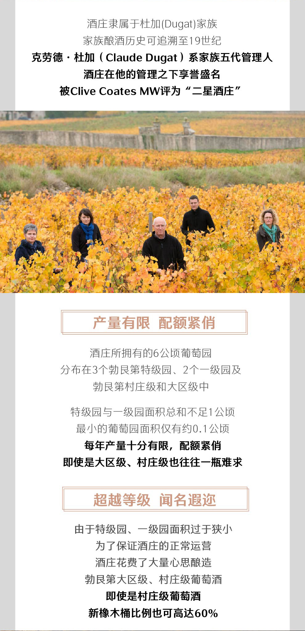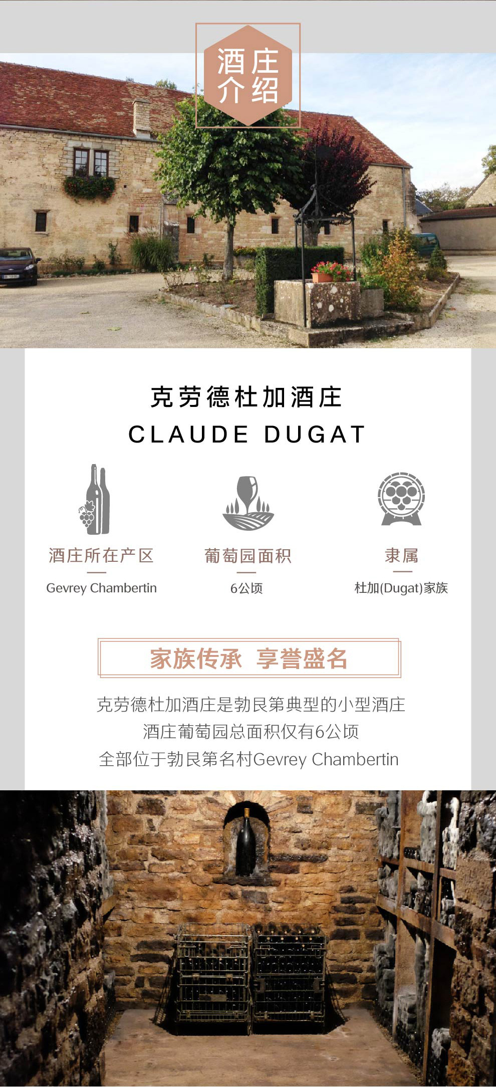 克劳德杜加酒庄(Claud Dugat)坐落于夜丘(Cote de Nuits)内的一个产酒村庄——热夫雷-香贝丹(Gevrey Chambertin)。这里出产的特级葡萄园和一级葡萄园级别的葡萄酒,在世界上堪称最出众的勃艮第葡萄酒。