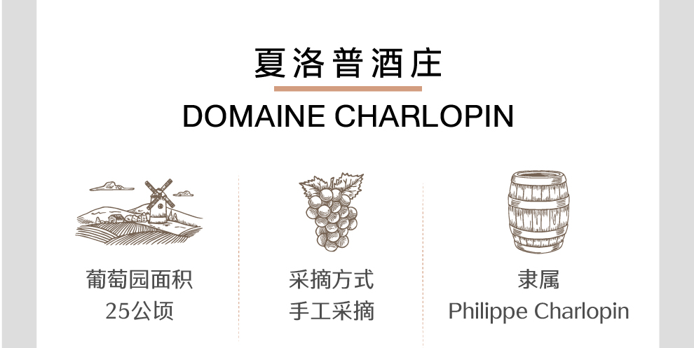 夏洛普酒庄创立于1977年,当时,菲利普·夏洛普(Philippe Charlopin)接管了家族生意及1.5公顷的葡萄园。现在,夏洛普酒庄经过不断地发展壮大之后,酒庄的葡萄园面积已经扩展至25公顷,分别分布在夜丘(Cote de Nuits)、伯恩丘(Cote de Beaune)和夏布利(Chablis)三个葡萄酒产区,主要种植着黑皮诺(Pinot Noir)和霞多丽(Chardonnary)这两个葡萄品种。