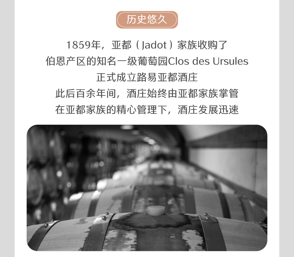 路易亚都酒庄由亚都(Jadot)家族于1859年创立,当时他们买下了伯恩(Beaune)区一座知名的一级葡萄园—乌尔苏礼克洛 (Clos des Ursules)。在接下来的一百多年里,酒庄一直由亚都家族掌管。1985年,这家酒庄被一个来自美国纽约的家族——科普夫 (Kopf)家族收购。这个家族的掌门人一直致力于收购顶级葡萄园。只要有可能收购到的,他们就不会错过。至今,该酒庄仍由科普夫家族掌管。现任庄主是皮埃尔•亨利•加吉(Pierre Henry Gagey)。