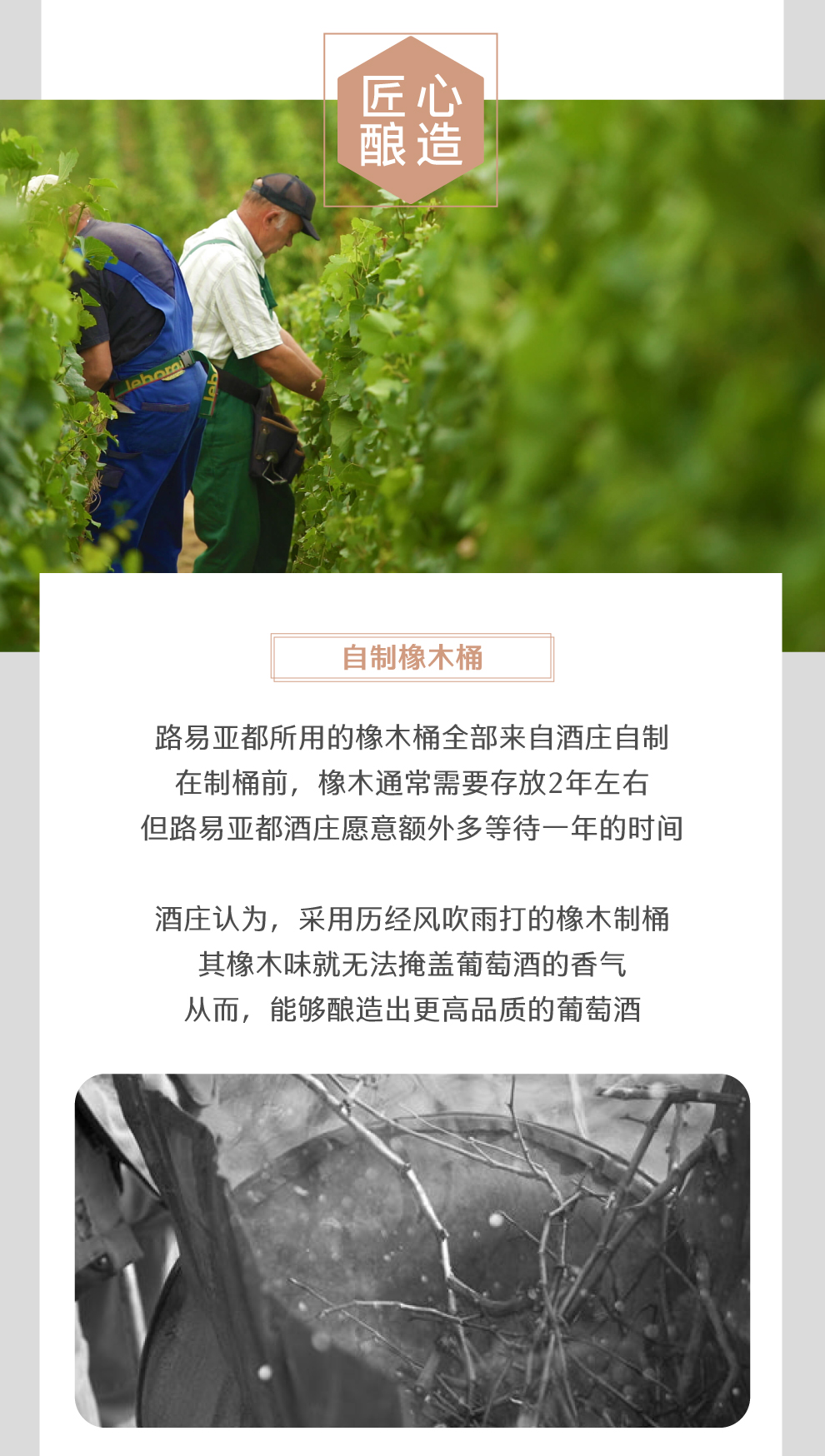 在酿酒方面,路易亚都所用的葡萄来于自家的葡萄园,或者是依照合同从葡萄种植者手中买来,这种做法在其他酒庄非常少见。该酒庄所用木桶均是自制的,技术娴熟的工匠一天可以做五个木桶。通常,橡木在制桶之前一般要放两年左右,而路易亚都酒庄则更愿意耐心地多等一年。在他们看来,经过风吹雨打后的橡木,制作出来的橡木桶,其橡木味就不会掩盖住酒香,这样能保证酒的高质量。