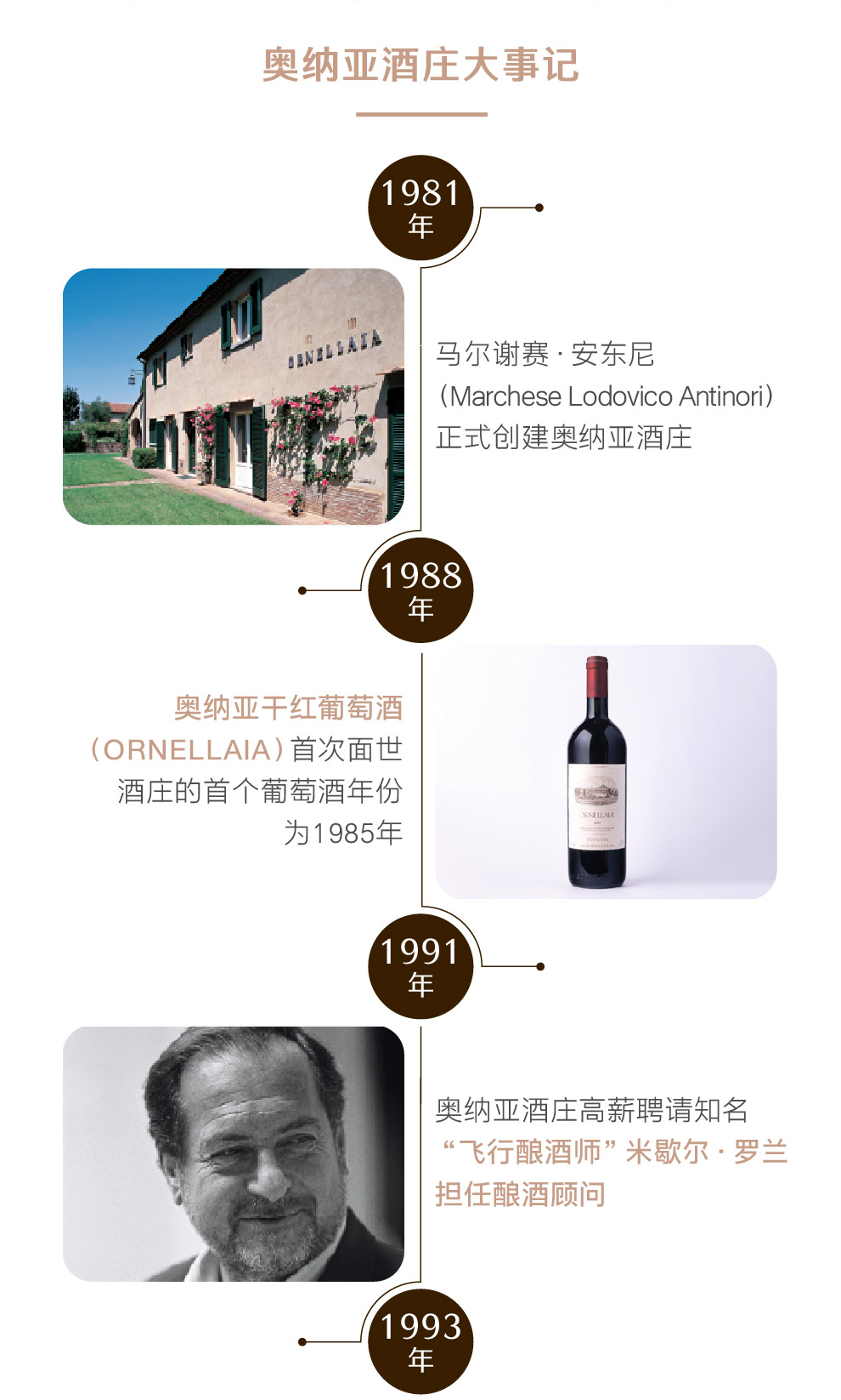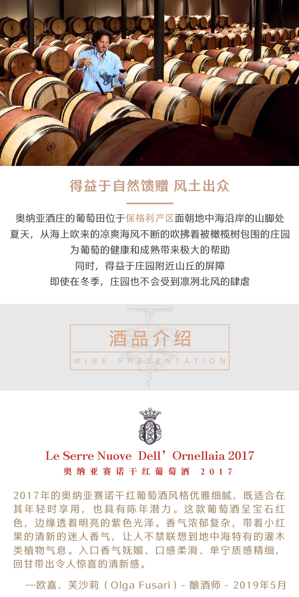 位于意大利托斯卡纳(Tuscany)产区最美丽的自然之地,庄园坚持以酿造品质卓越的葡萄酒为首要追求。对葡萄酒的热情和品质的专注以及得天独厚的风土,创造了奥纳亚酒庄颇受赞誉的葡萄佳酿,并因此奠定了酒庄在全球名庄中的重要地位。