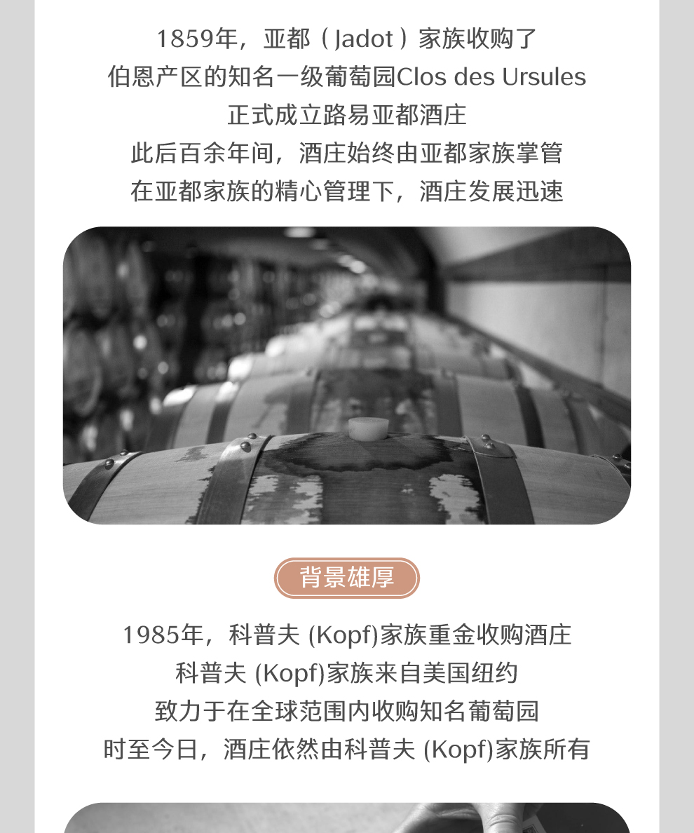 路易亚都酒庄由亚都(Jadot)家族于1859年创立,当时他们买下了伯恩(Beaune)区一座知名的一级葡萄园—乌尔苏礼克洛 (Clos des Ursules)。在接下来的一百多年里,酒庄一直由亚都家族掌管。1985年,这家酒庄被一个来自美国纽约的家族——科普夫 (Kopf)家族收购。这个家族的掌门人一直致力于收购顶级葡萄园。只要有可能收购到的,他们就不会错过。至今,该酒庄仍由科普夫家族掌管。现任庄主是皮埃尔•亨利•加吉(Pierre Henry Gagey)。