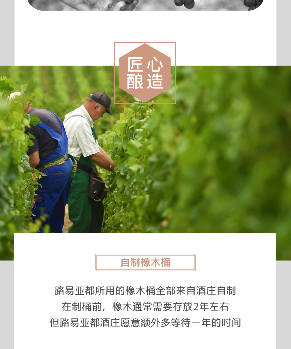 在酿酒方面,路易亚都所用的葡萄来于自家的葡萄园,或者是依照合同从葡萄种植者手中买来,这种做法在其他酒庄非常少见。该酒庄所用木桶均是自制的,技术娴熟的工匠一天可以做五个木桶。通常,橡木在制桶之前一般要放两年左右,而路易亚都酒庄则更愿意耐心地多等一年。在他们看来,经过风吹雨打后的橡木,制作出来的橡木桶,其橡木味就不会掩盖住酒香,这样能保证酒的高质量。