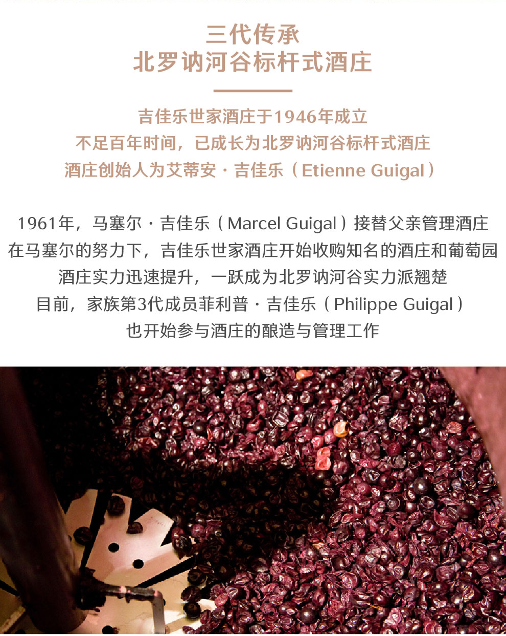 吉佳乐世家酒庄(E. Guigal)是罗第丘(Cote-Rotie)最富盛名,也是最重要的酒庄。1946年,艾蒂安•吉佳乐(Etienne Guigal)在罗第丘的酿酒中心阿布斯村(Ampuis)创建了该酒庄。阿布斯村历史悠久,其葡萄园已有超过2,400年的历史,至今仍保留着罗马时代的建筑物。1923年,14岁的艾蒂安•吉佳乐来到这里。他决定投身于酿酒业,一干就干了67年多。在1961年,年轻的马塞尔•吉佳乐(Marcel Guigal)接替了父亲管理酒庄。在马塞尔的努力下,吉佳乐世家酒庄开始收购一些知名的酒庄,实力不断提升。现在,该家族的第3代成员菲利普•吉佳乐(Philippe Guigal)担任着该酒庄的酿酒师,与伯尔纳德(Bernadette)、马塞尔(Marcel)一起构成酒庄的核心力量。