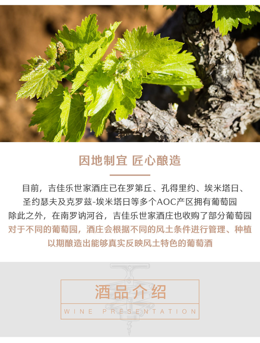 吉佳乐世家酒庄的酒窖至今仍位于阿布斯村,生产罗第、孔德里约(Condrieu)、埃米塔日(Hermitage)、圣约瑟夫(St.-Joseph)以及克罗兹-埃米塔日(Crozes- Hermitage)等多个AOC酒款,而该酒庄在罗讷河谷南部生产的教皇新堡(Chateauneuf-du-Pape)、吉恭达斯(Gigondas)、塔维勒(Tavel)和罗讷河谷丘(Cotes du Rhone)的酒款也会在这里陈年。吉佳乐世家酒庄的总部位于阿布斯堡(Chateau d’Ampuis)。这座城堡建于12世纪,周围围绕着大片的葡萄树,曾接待过多位法国君主,现在已经成为当地的名胜。
