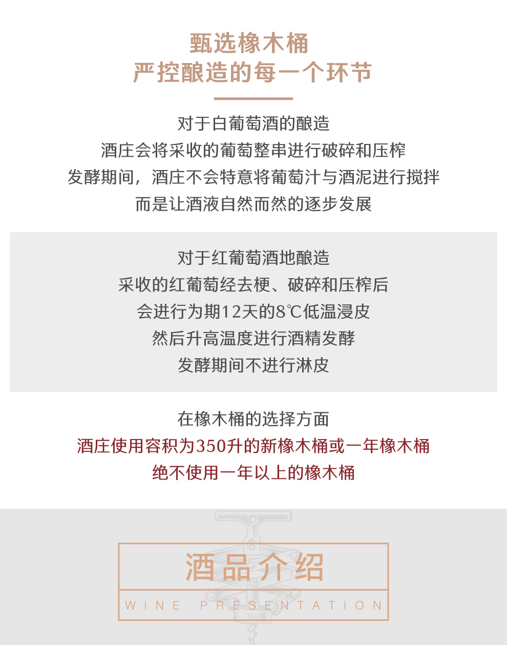 亨利布瓦洛酒庄在酿制白葡萄酒时会将采收的葡萄整串进行破碎和压榨,发酵期间,酒庄不会为了加速葡萄酒的成熟而特意将葡萄的汁液与酒泥进行搅拌。此外,采收的红葡萄经去梗、破碎和压榨后,会进行为期12天的8℃低温浸皮,然后升高温度进行酒精发酵,发酵期间不进行淋皮。葡萄酒熟成时,亨利布瓦洛酒庄使用容积为350升的新橡木桶或一年橡木桶,绝不使用一年以上的橡木桶。此外,酒庄出产的葡萄酒会在橡木桶中熟化18个月,之后在酒庄进行装瓶和包装。