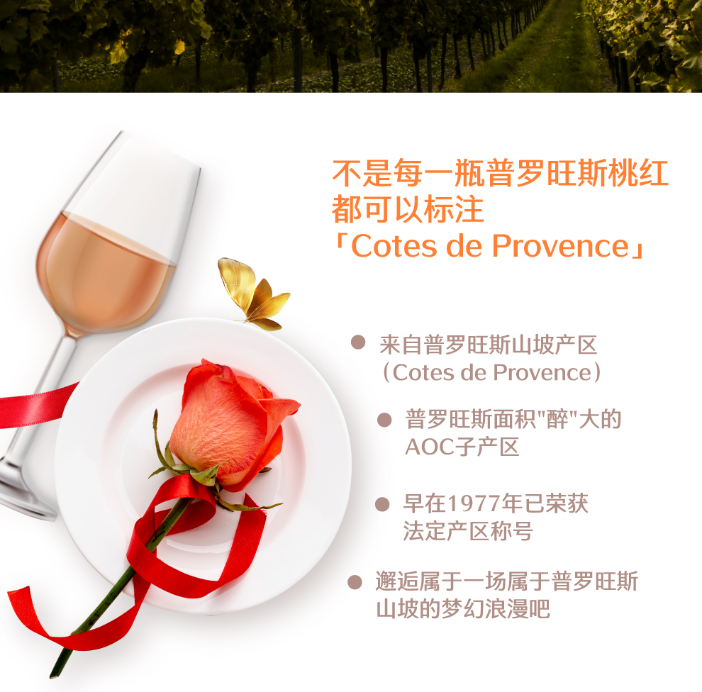 普罗旺斯地处法国南部,位于罗讷河谷产区东南边,从地中海沿岸延伸到内陆的丘陵地区,主要出产桃红葡萄酒。普罗旺斯丘(Cotes de Provence)是普罗旺斯最大的AOC次产区,桃红葡萄酒的产量占产区总产量的89%。并不是所有普罗旺斯(Provence)的葡萄酒都可以享有“Cotes de Provence” 的称号。只有18000 公顷的葡萄园,因为其气候,土壤和地理条件符合普罗旺斯(Provence)地区的特征而被授予原产地称号。出自这里的桃红葡萄酒带有清新的酸度和水果味,但又不失严谨的风范。