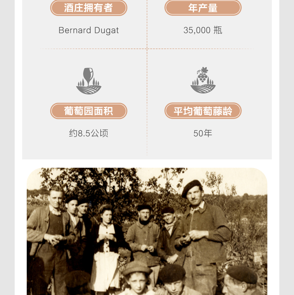 历经家族十三代积累的葡萄种植及酿酒经验“ 精选老藤黑皮诺 精心管理葡萄园地块”,其中多数是古老的葡萄藤(平均年龄为65岁,最古老的是1902年的葡萄藤)。