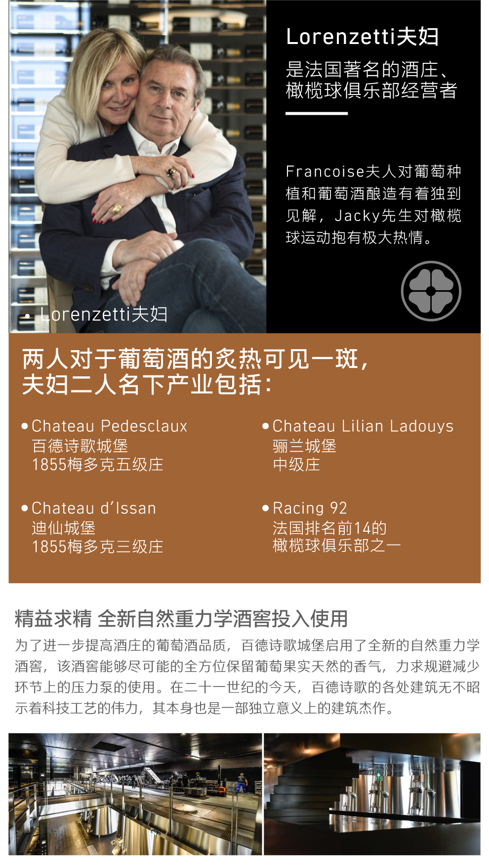 Lorenzetti夫妇是法国著名的酒庄、橄榄球俱乐部经营者。Francoise夫人对葡萄种植和葡萄酒酿造有着独到见解,Jacky先生对橄榄球运动抱有极大热情。
