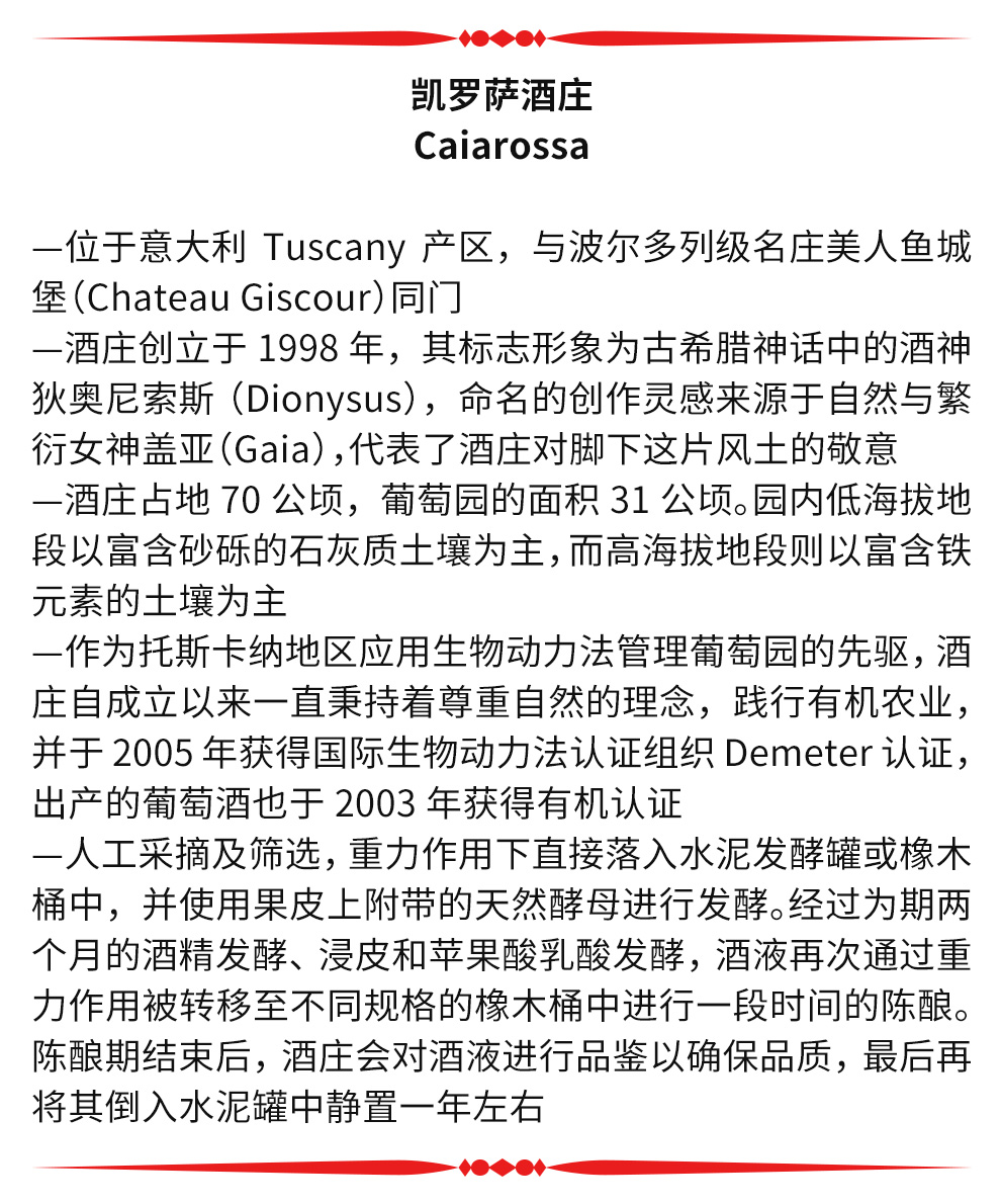 2004年荷兰人Eric Albada Jelgersma收购了Caiarossa酒庄。自此之后,在Jelgersma家族的精心管理之下, Caiarossa酒庄正式跻身于世界级高品质酒庄的行列。Jelgersma家族还同时拥有波尔多梅多克玛歌村三级名庄Château Giscours美人鱼城堡和五级名庄Château Tertre杜特城堡,有着数十年酒庄管理经验。